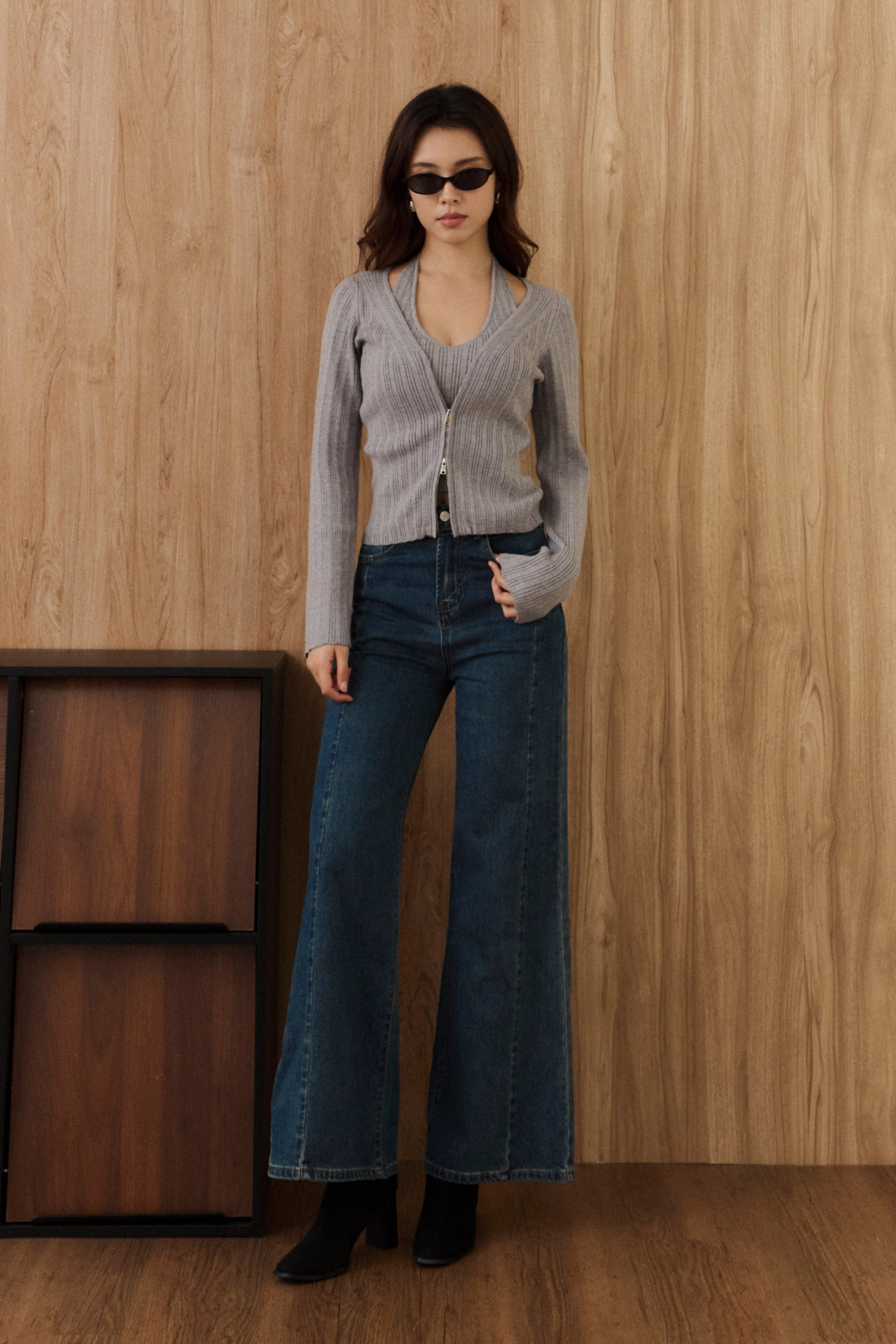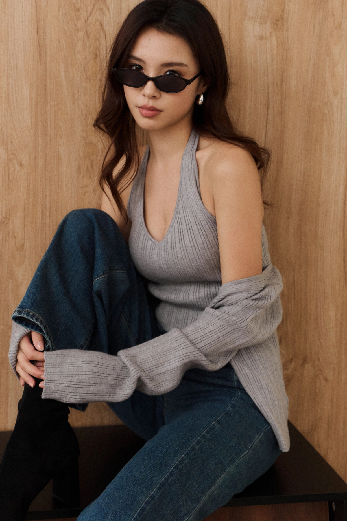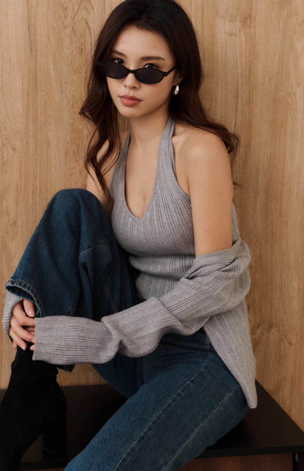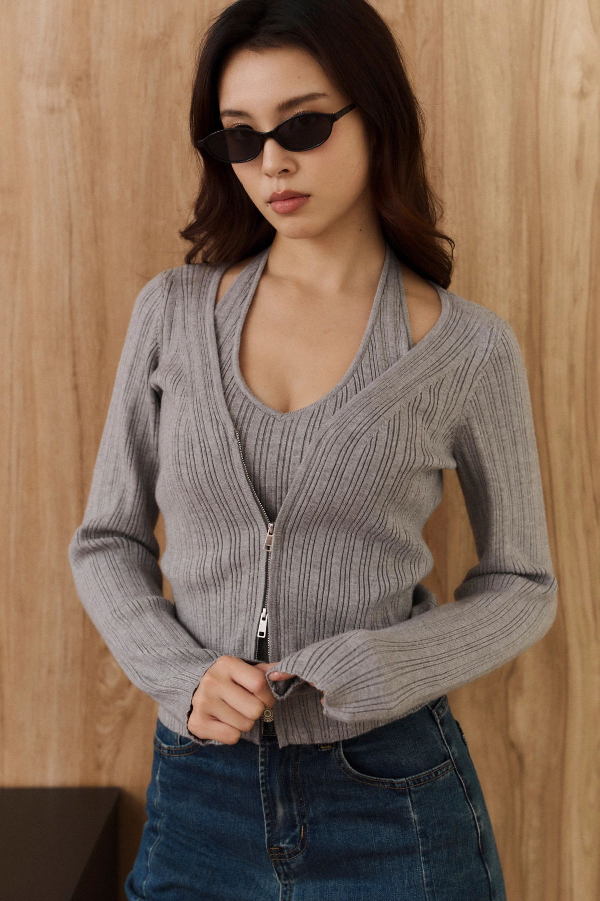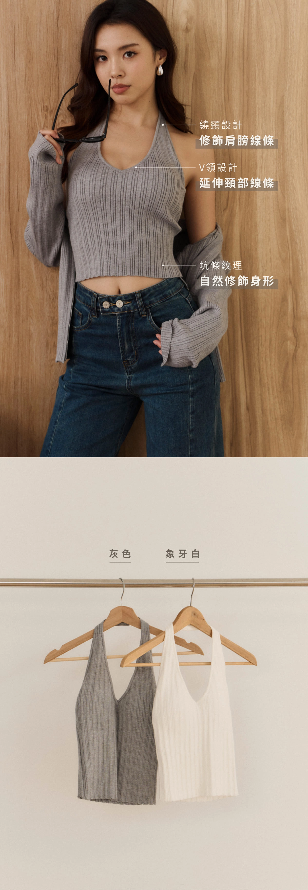 針織坑條V領繞脖Bra Top-灰