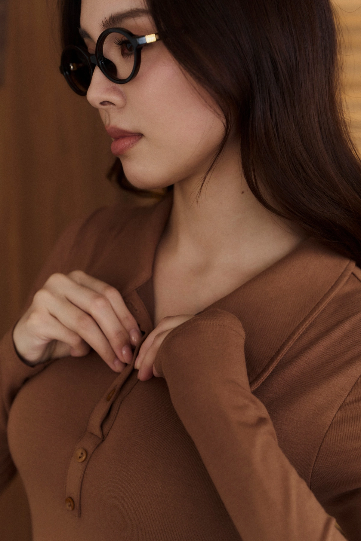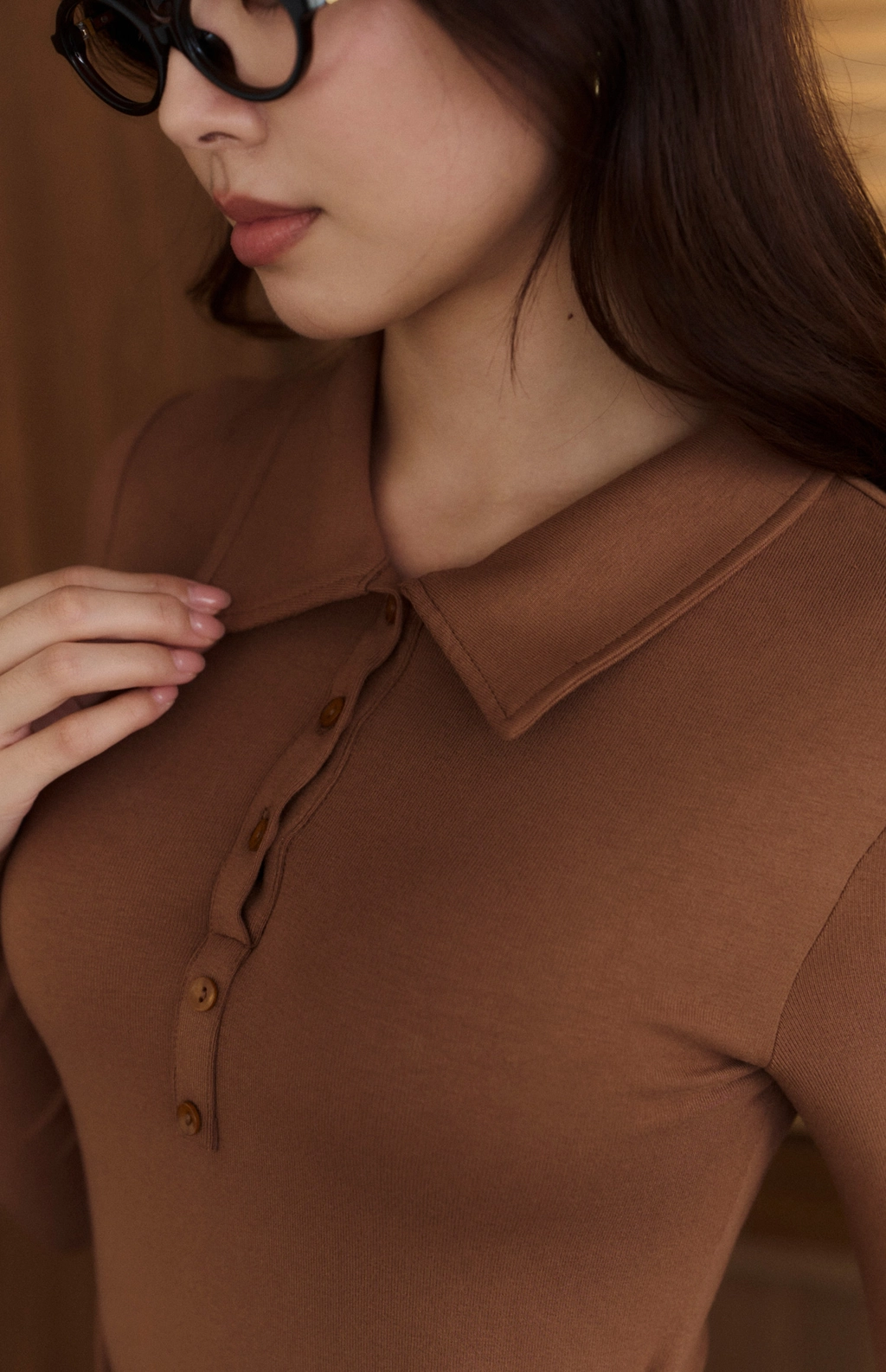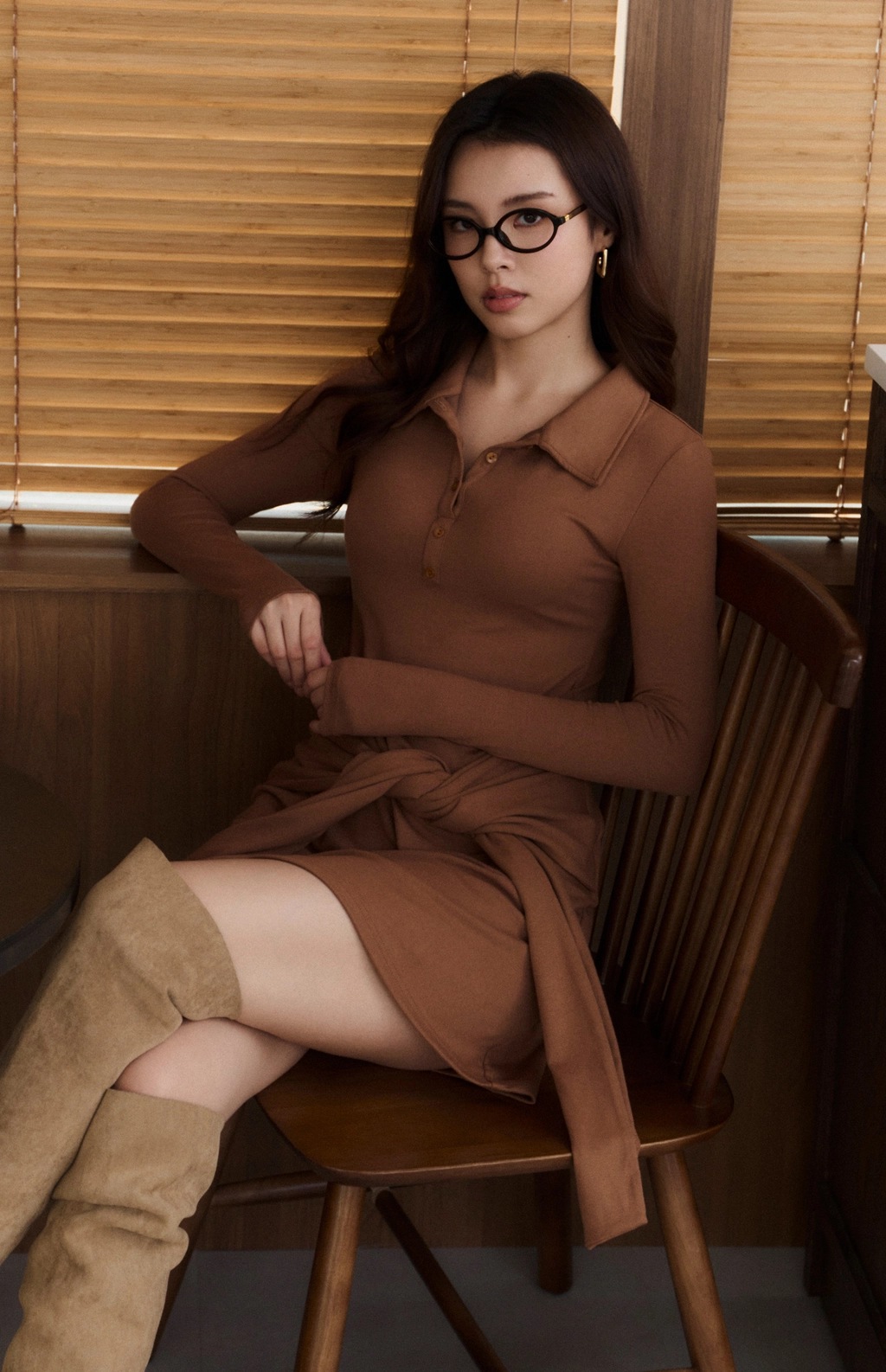 Polo領開釦綁帶假兩件 Bra Dress-焦糖