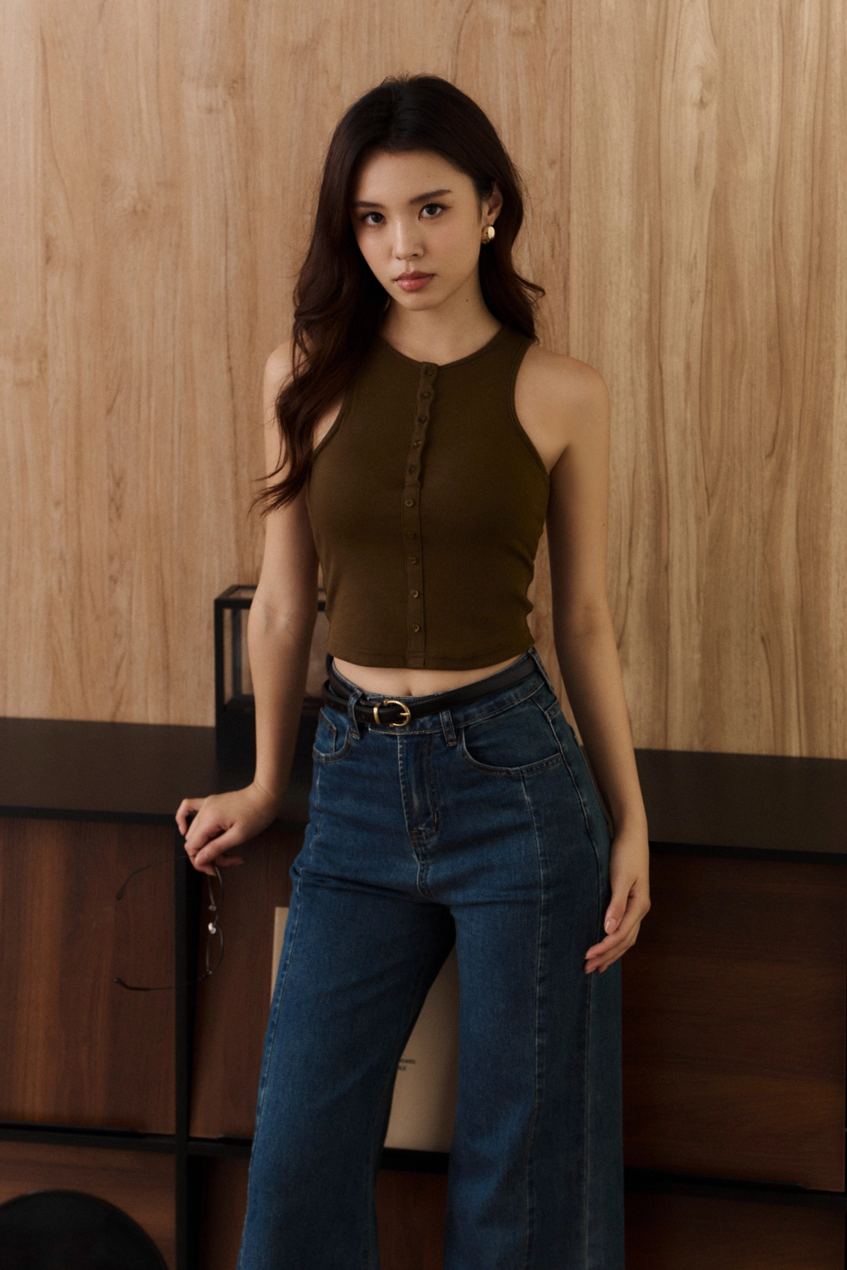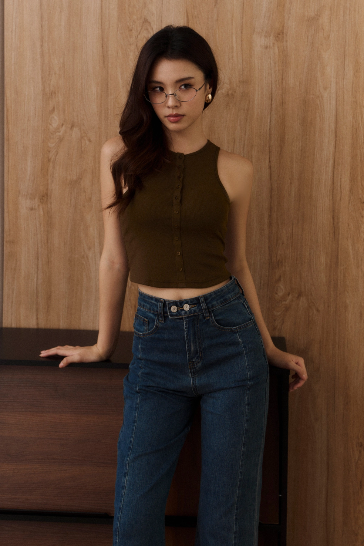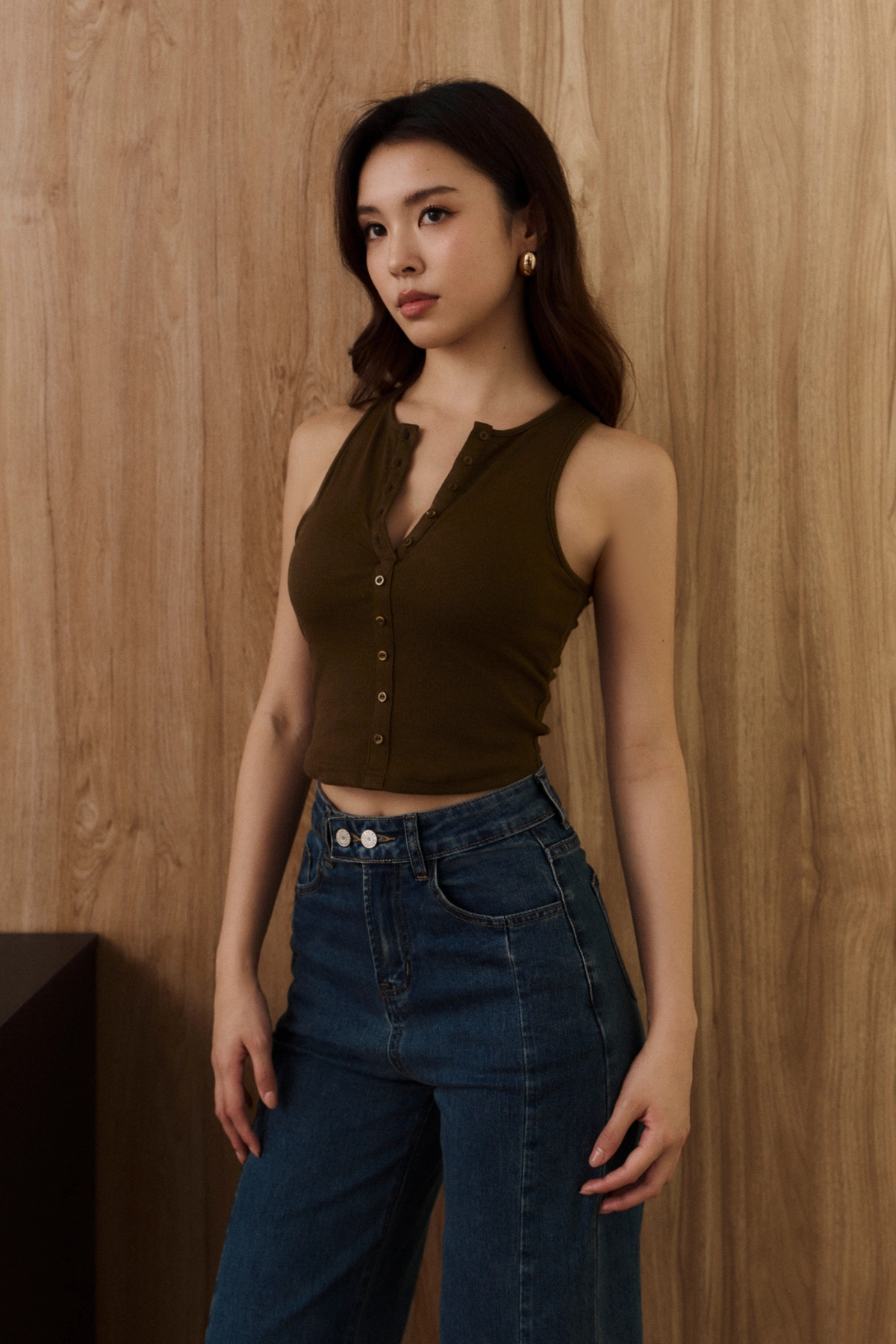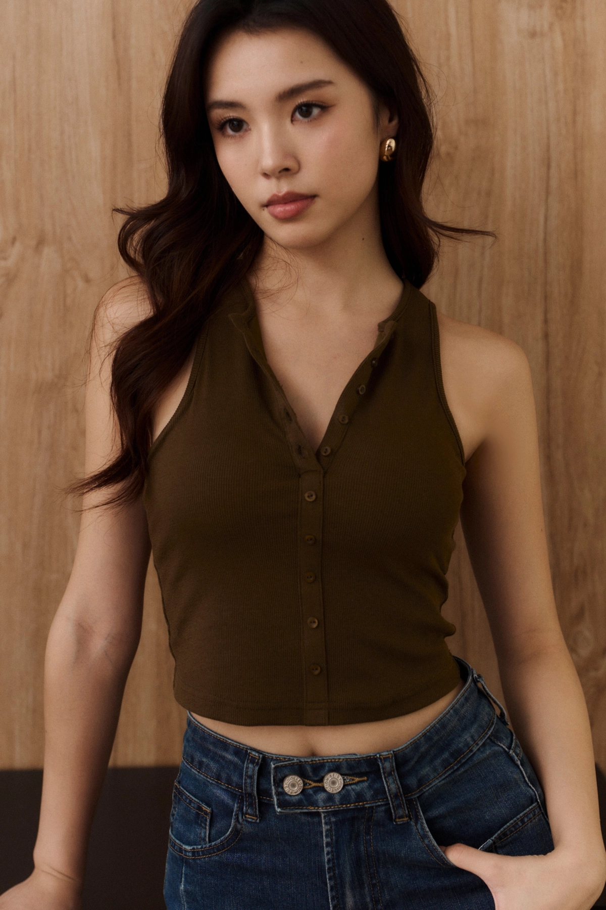 坑條削肩排釦Bra Top-焦糖綠