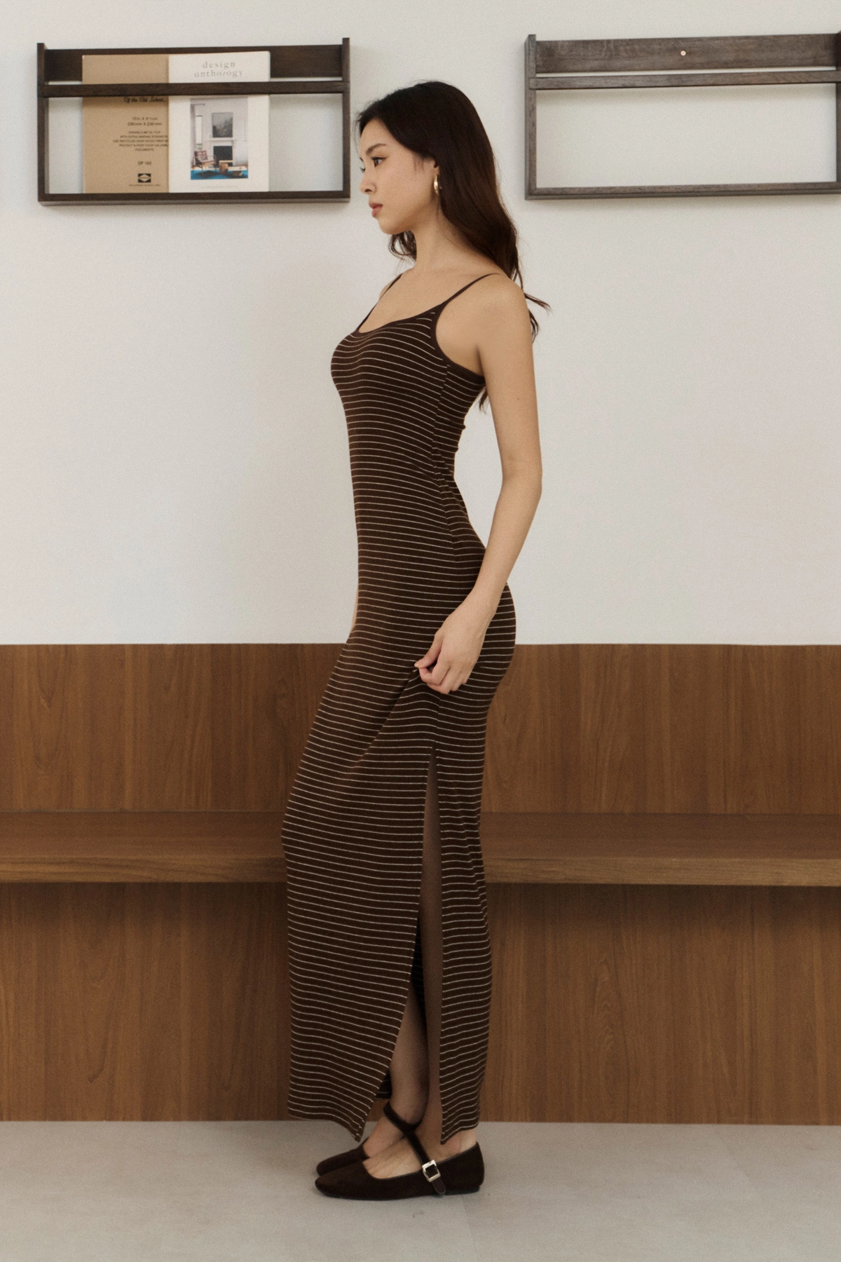 條紋側開衩顯瘦Bra Dress-咖底白條
