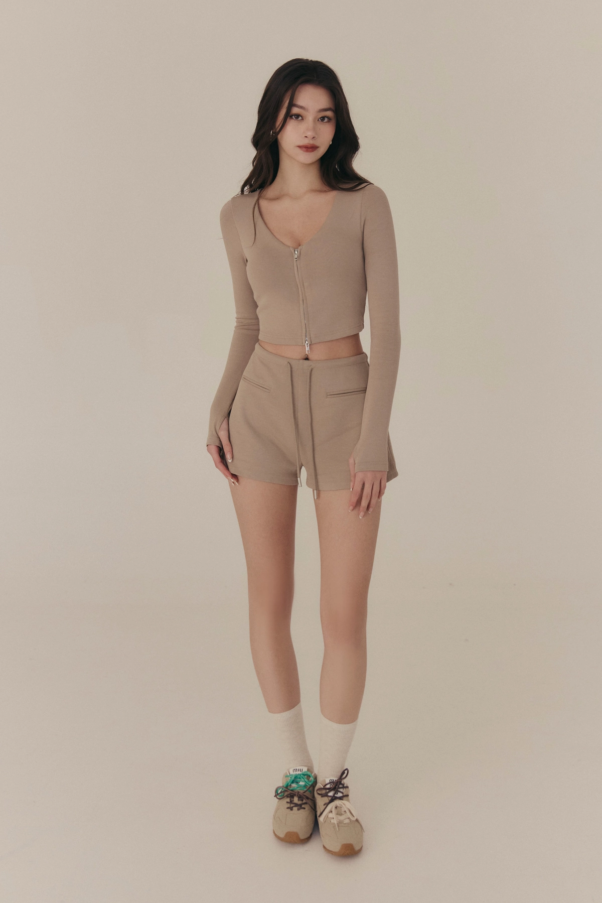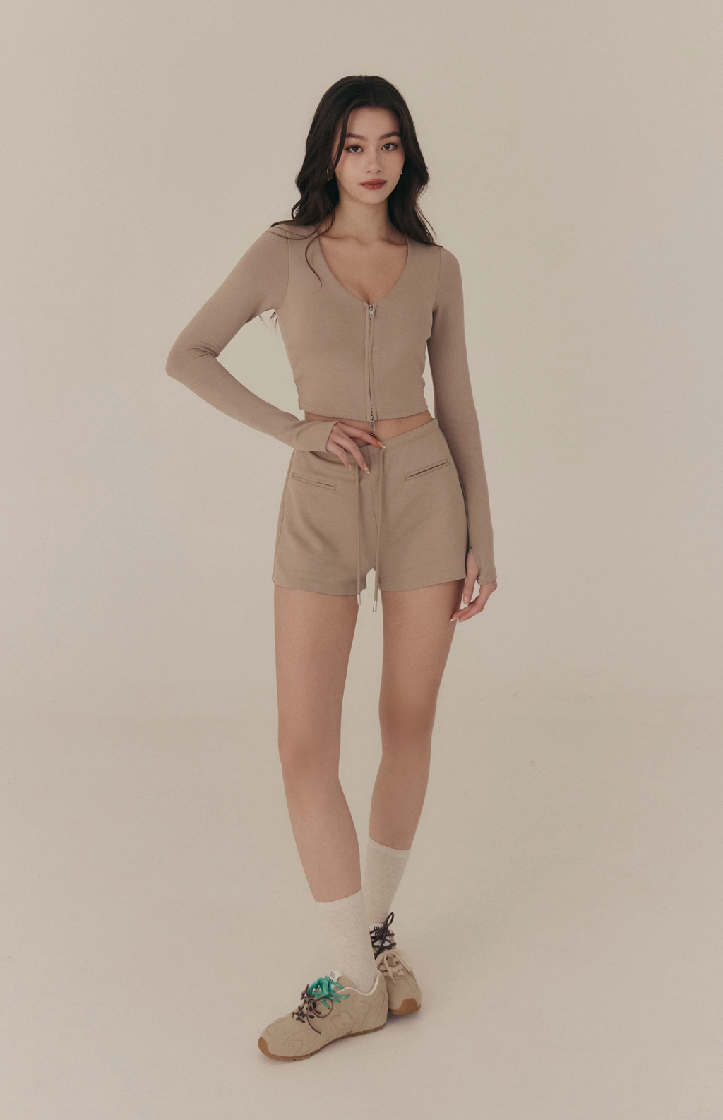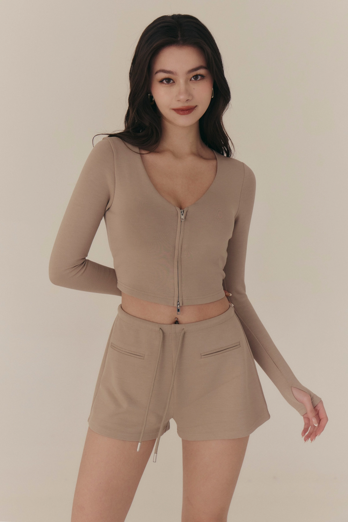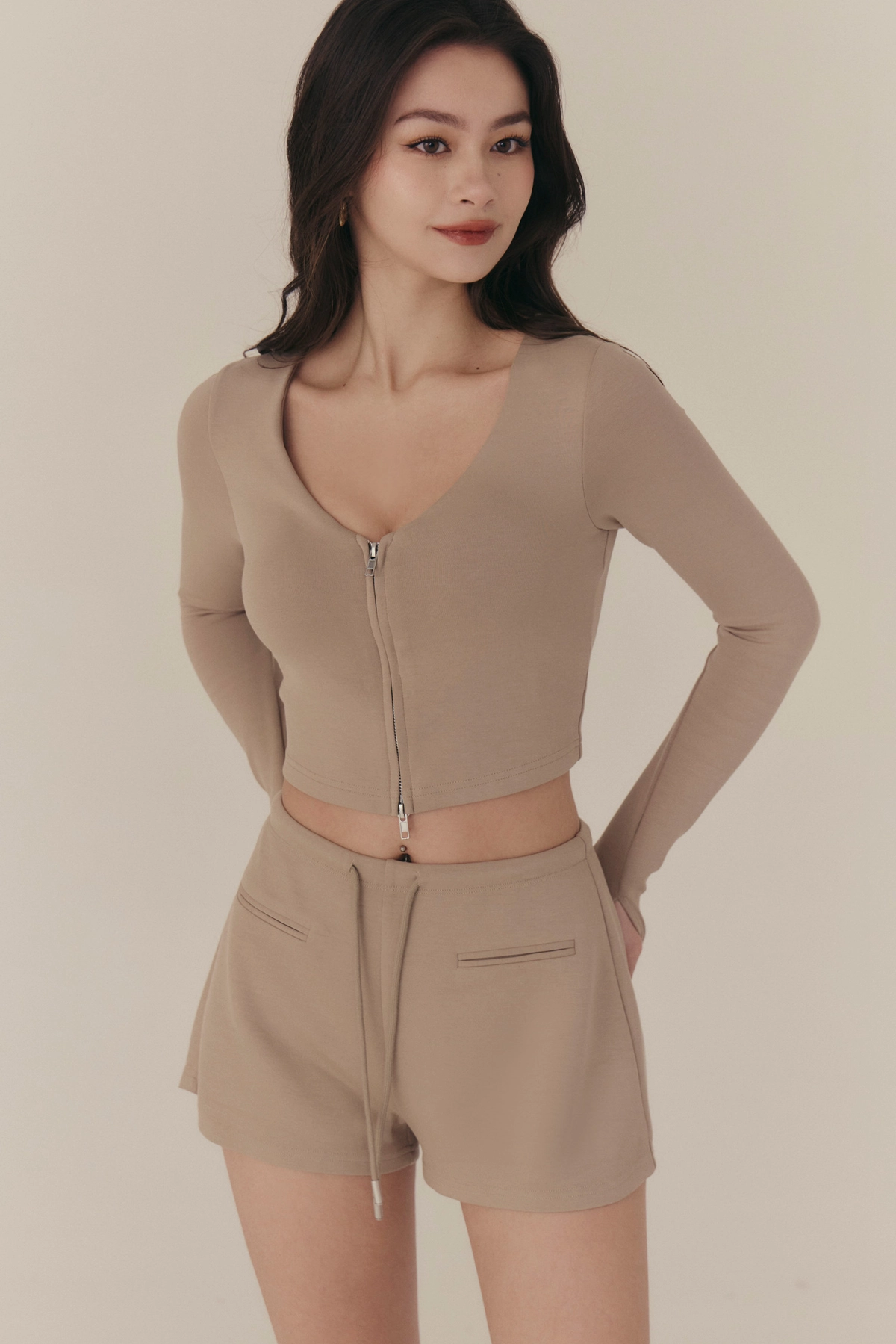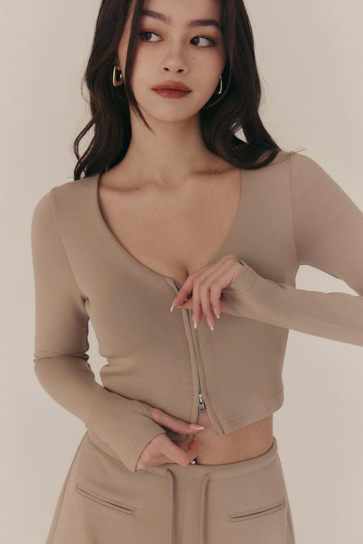 雲感V領修身拉鍊長袖Bra Top-奶咖