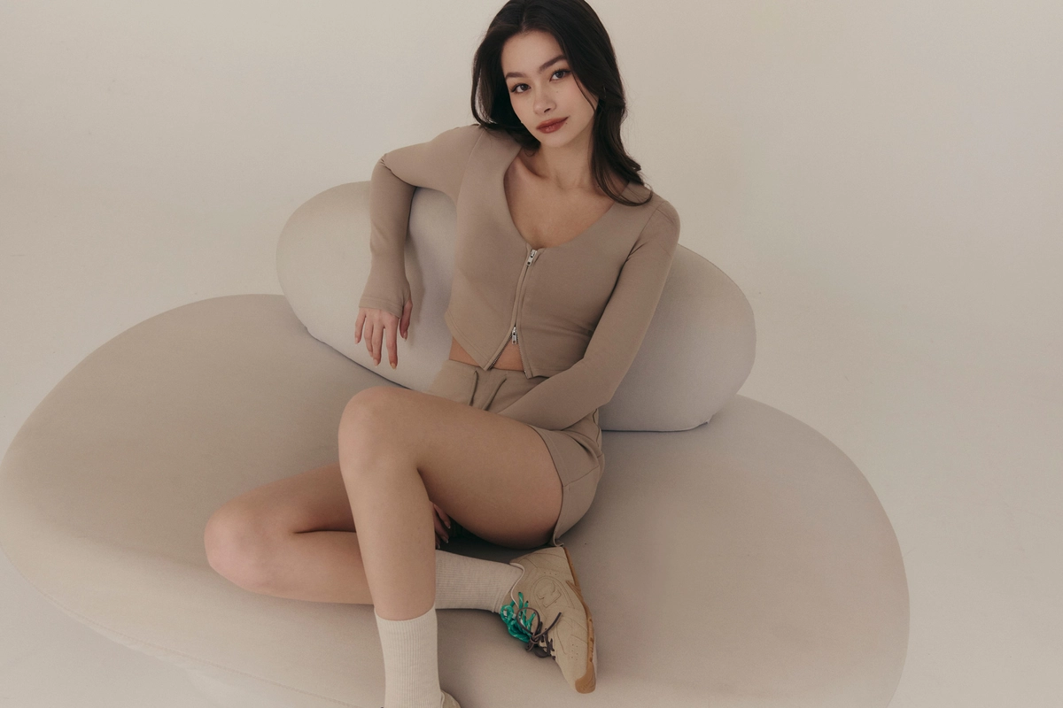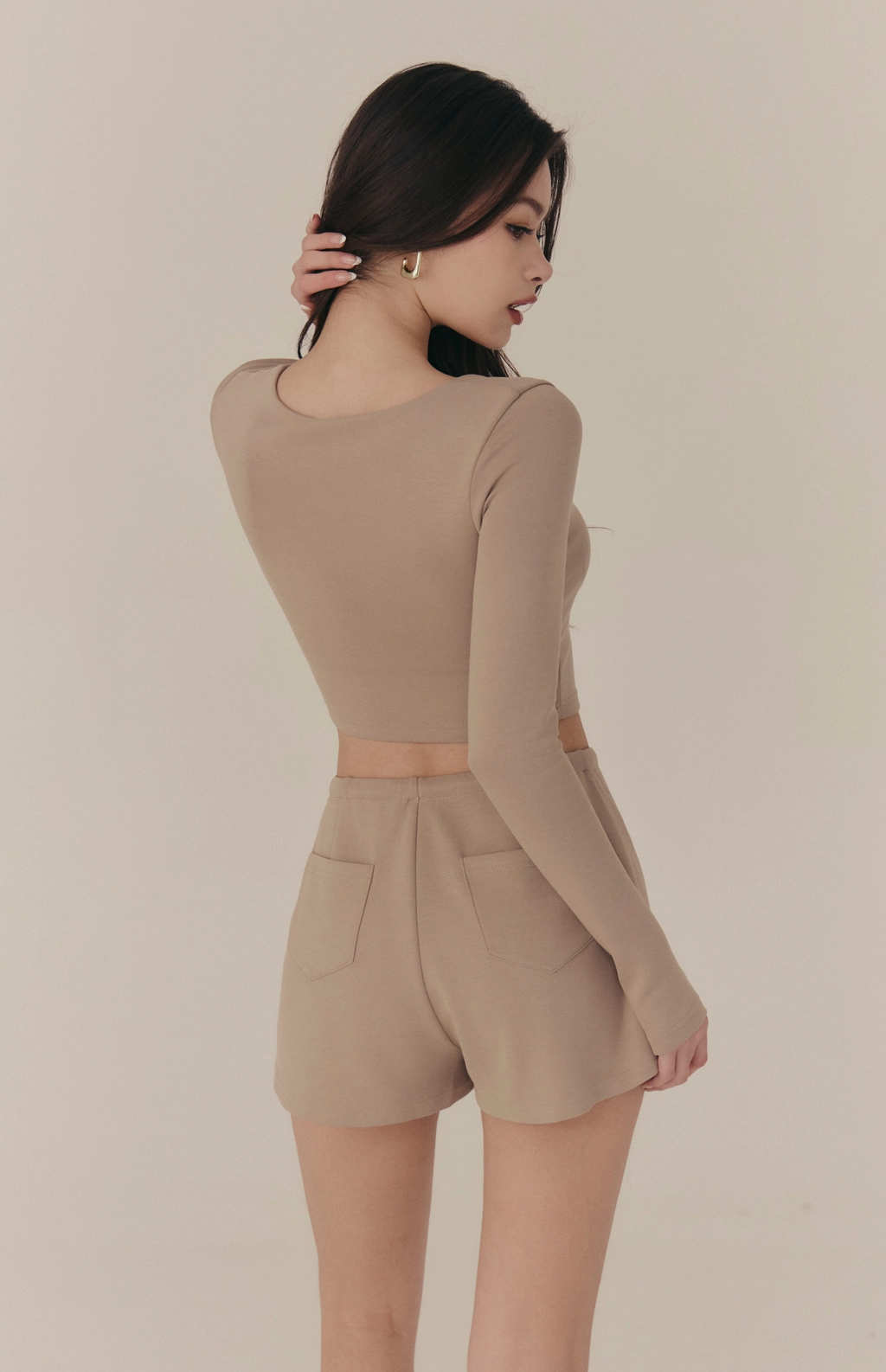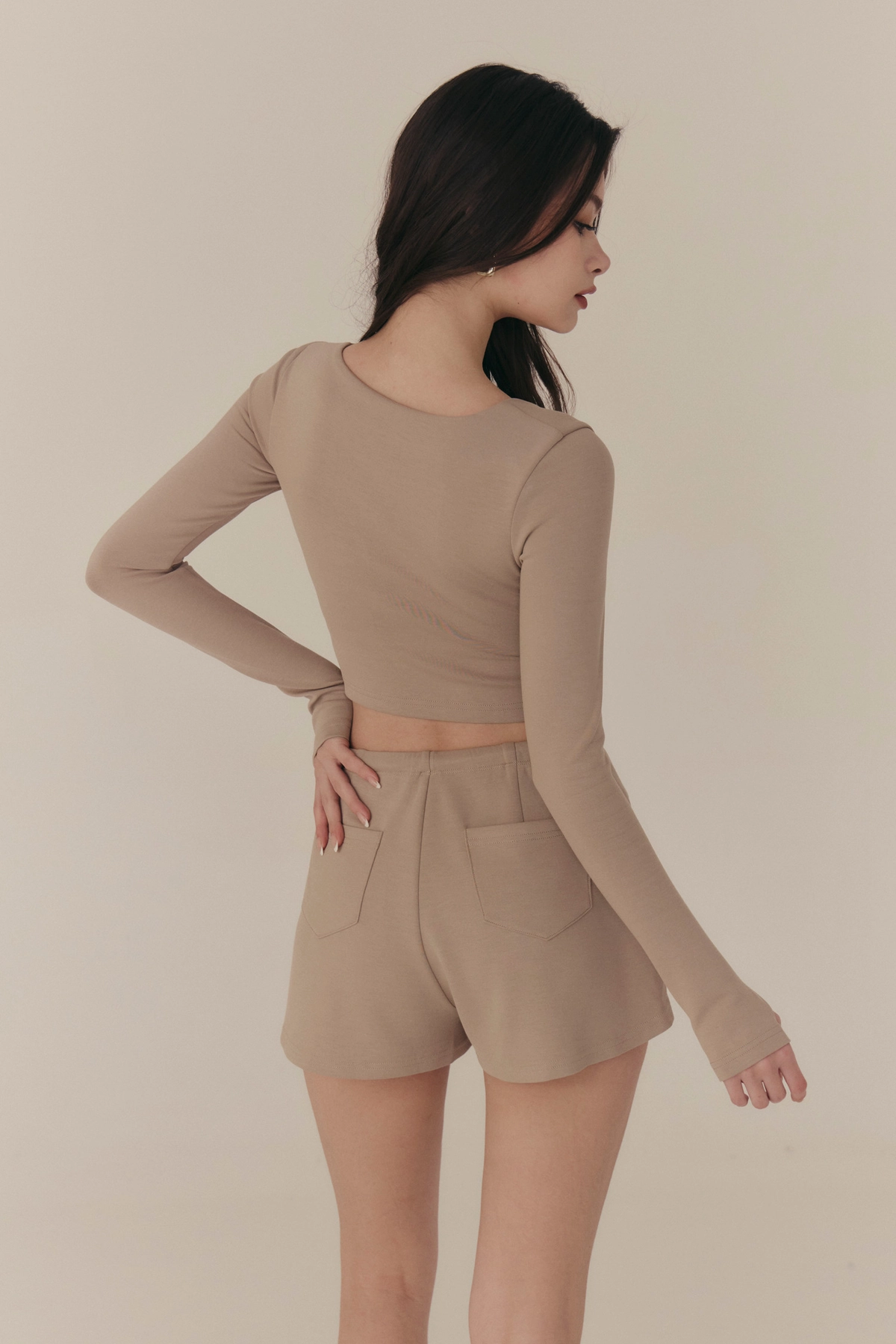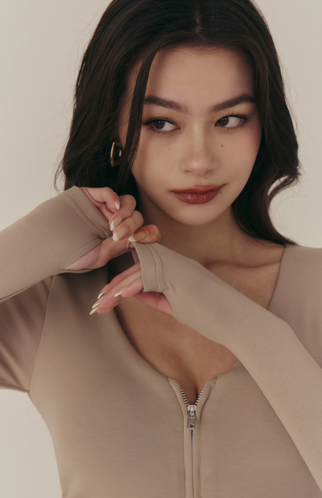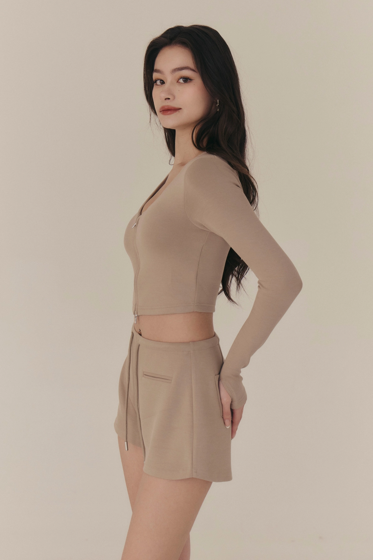 雲感V領修身拉鍊長袖Bra Top-奶咖
