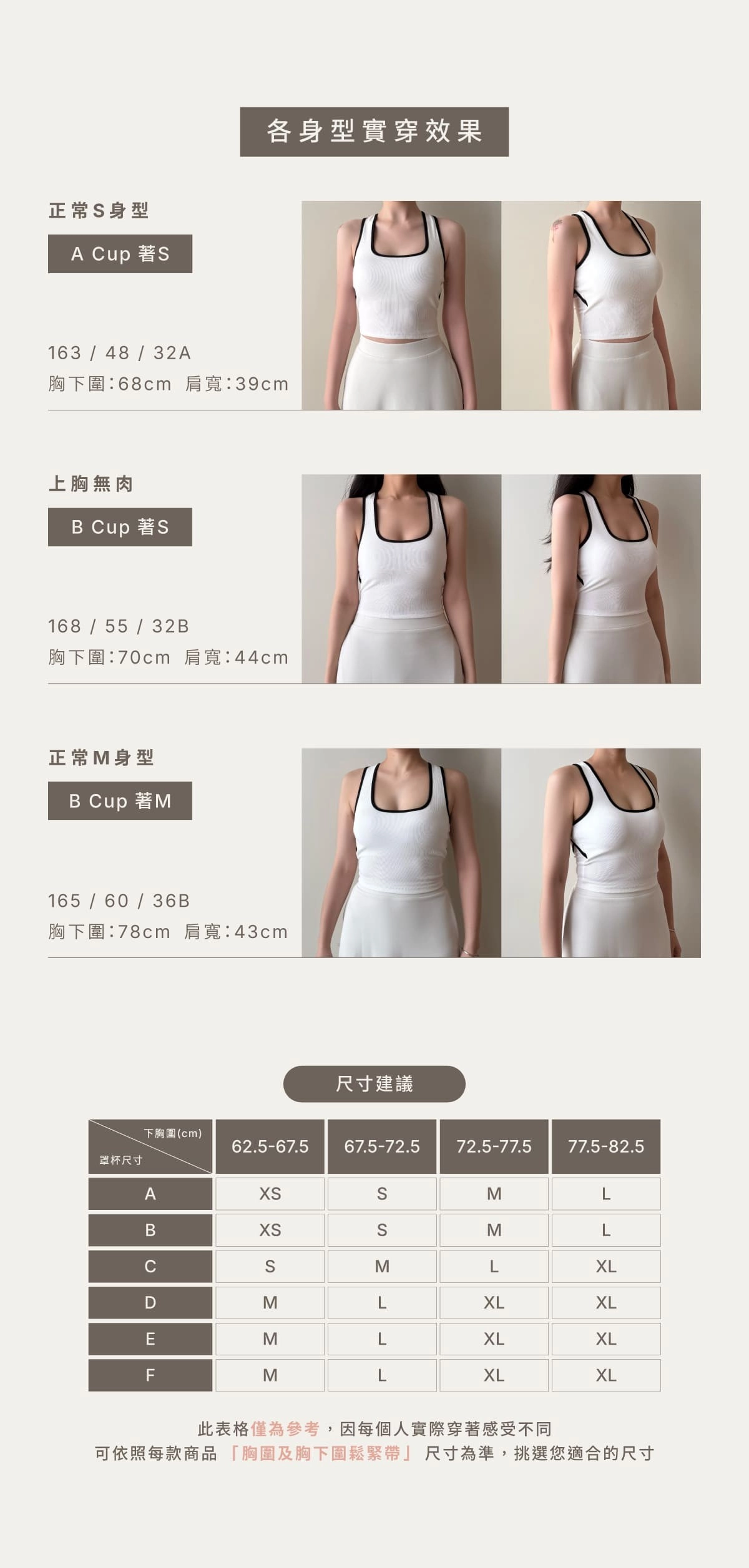 BRA TOP尺寸選購除了要參考罩杯外也需參考身高、體重