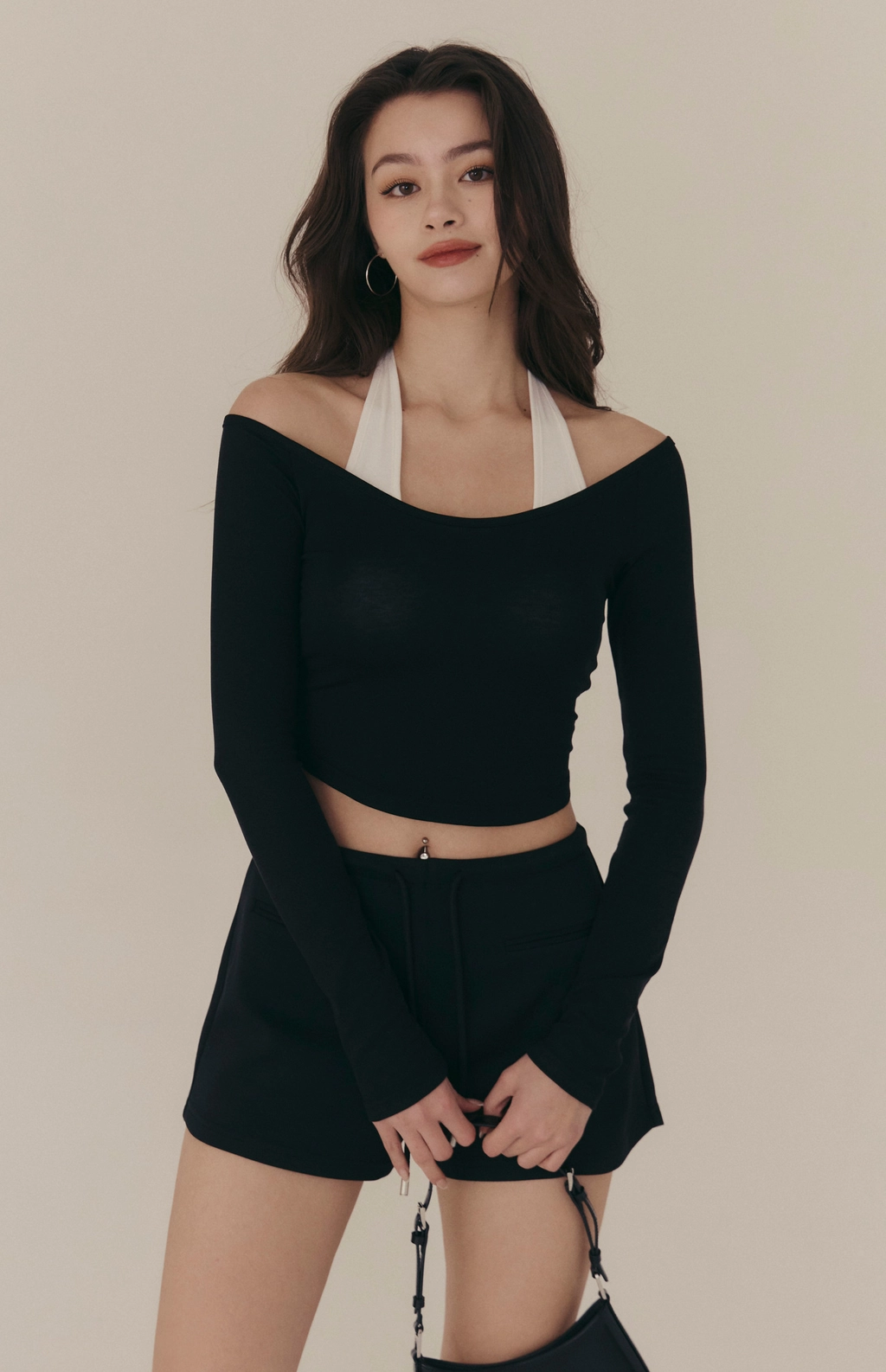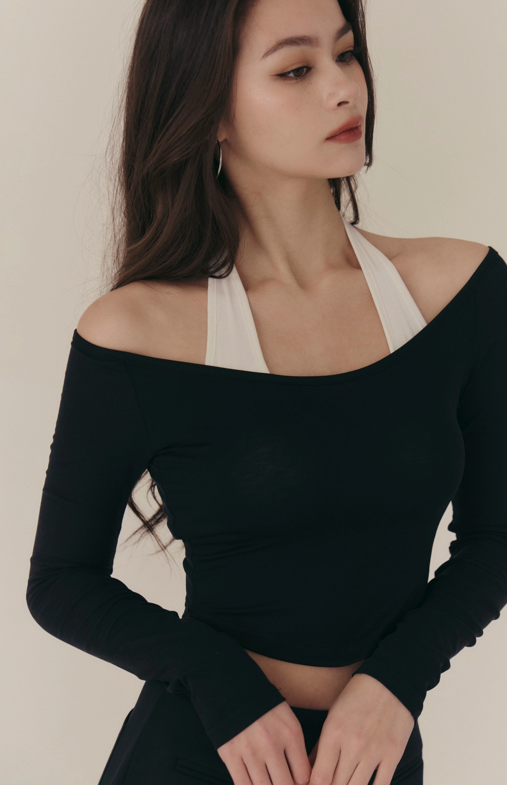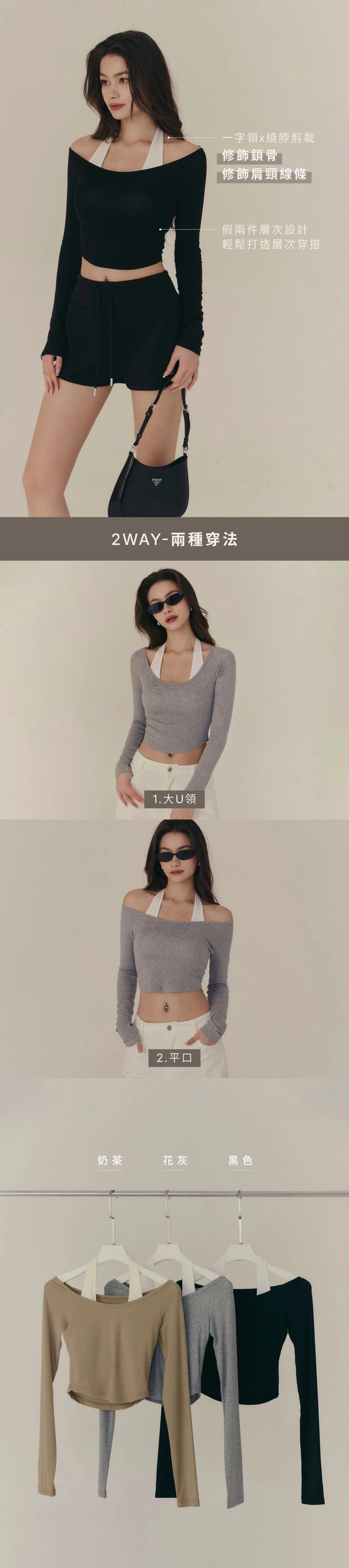 3.一字領x繞脖剪裁修飾鎖骨、肩頸線條