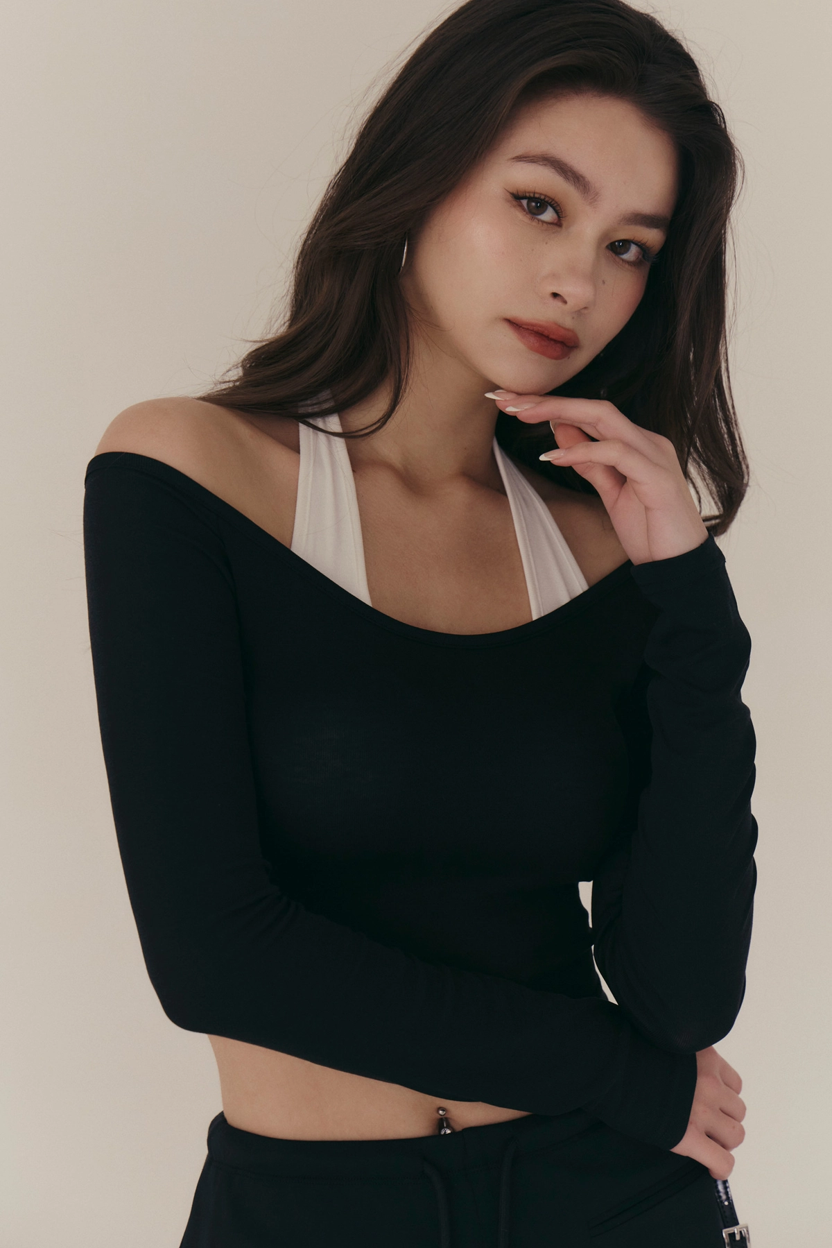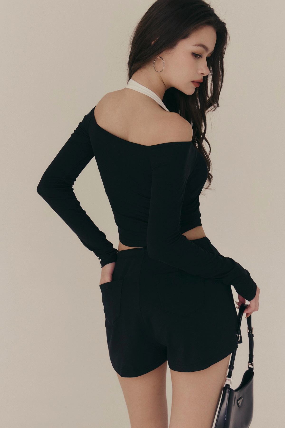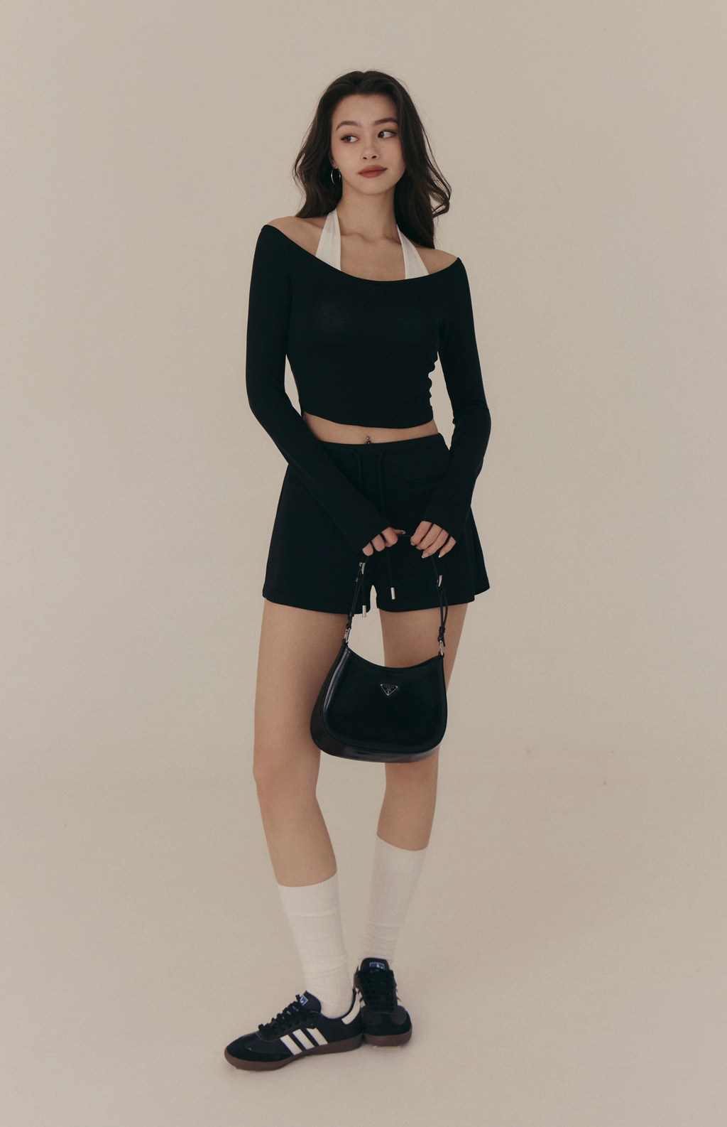 3.一字領x繞脖剪裁修飾鎖骨、肩頸線條