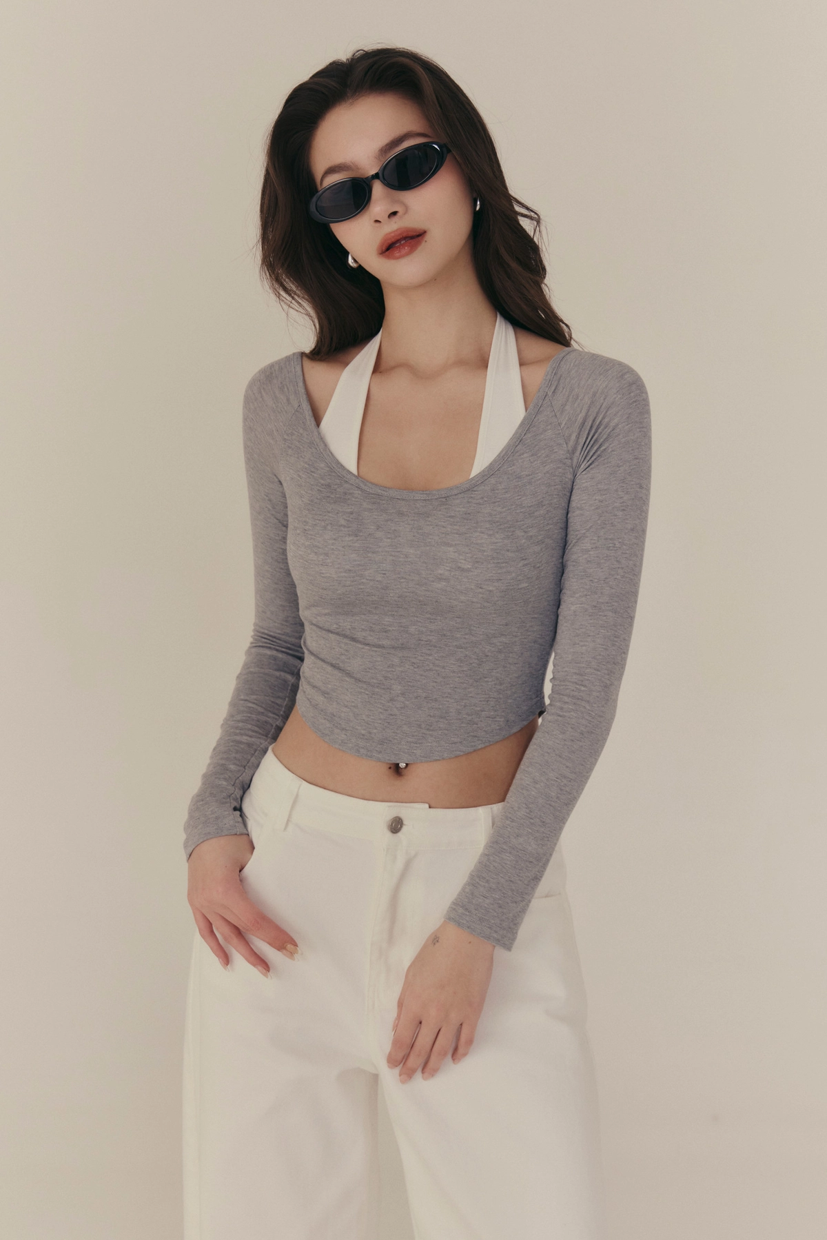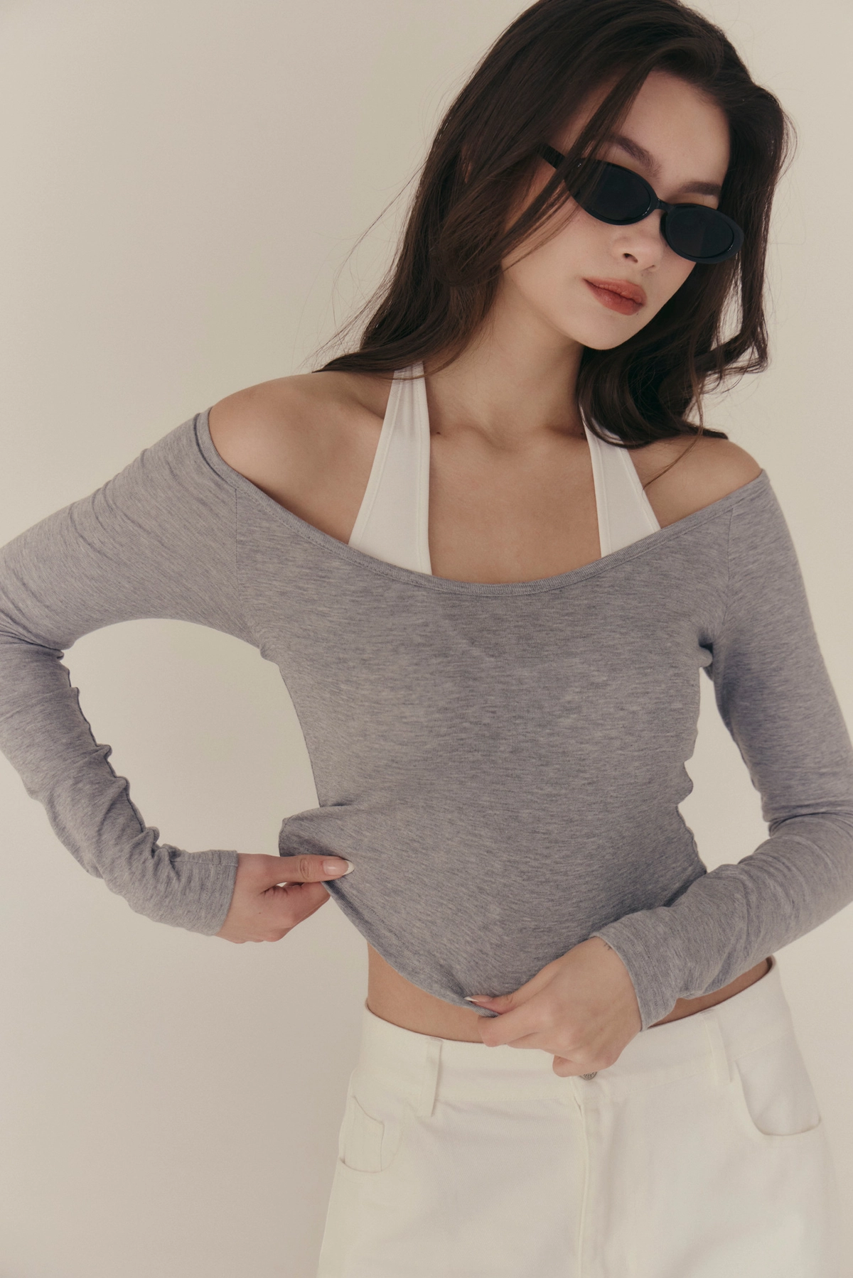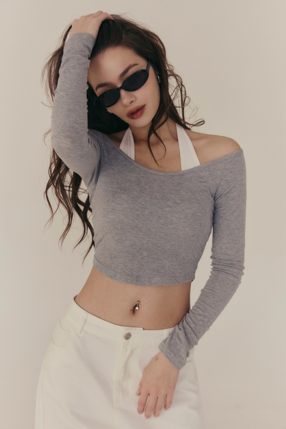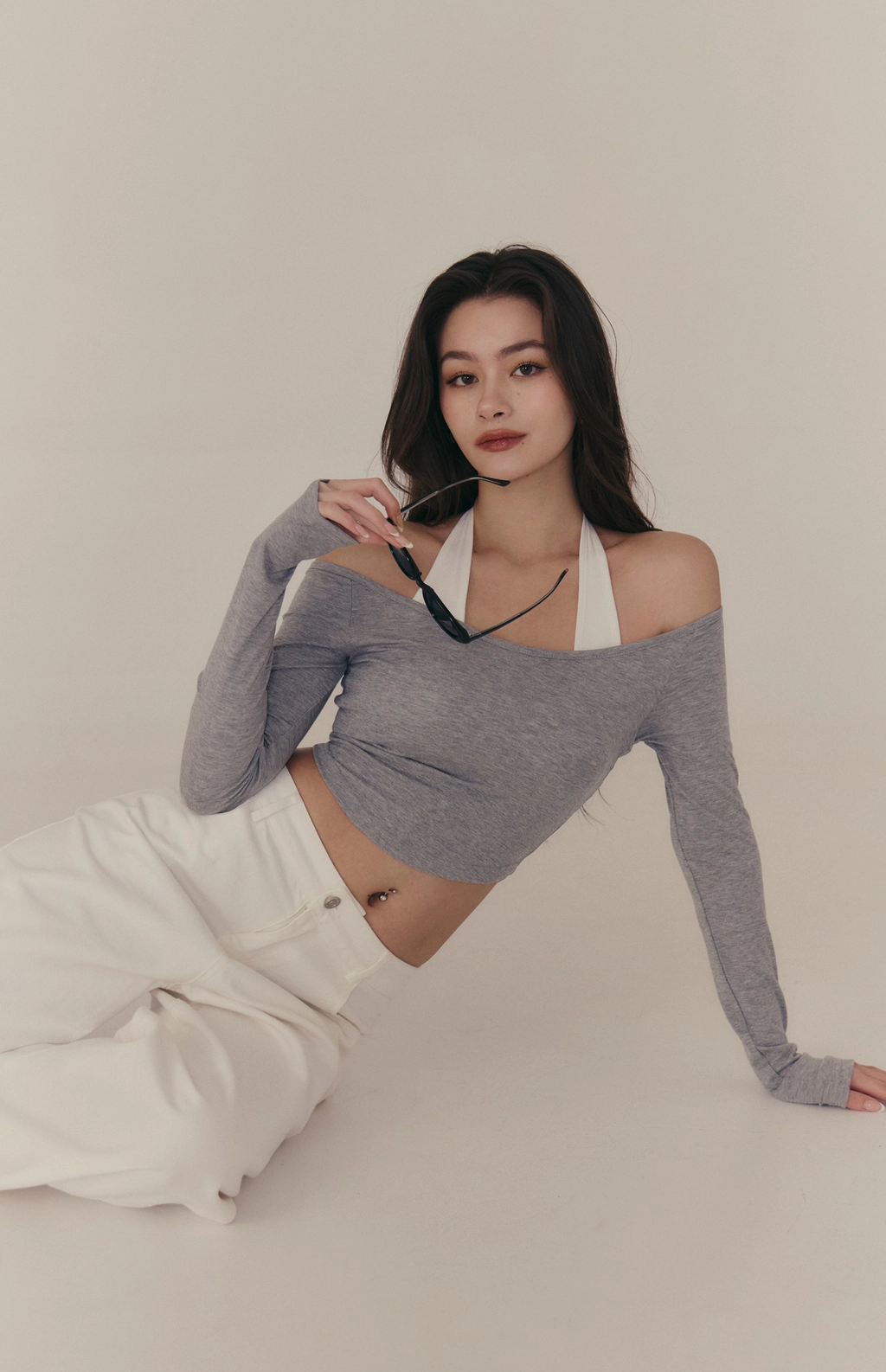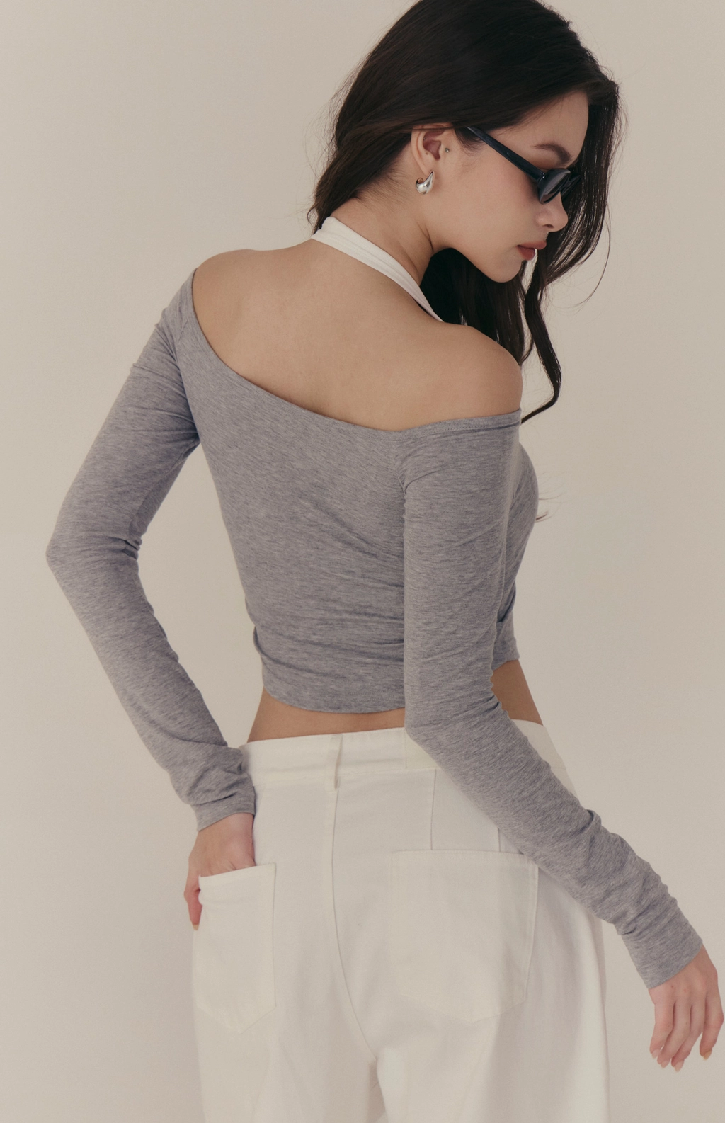 繞脖一字領假兩件長袖 Bra Top-花灰