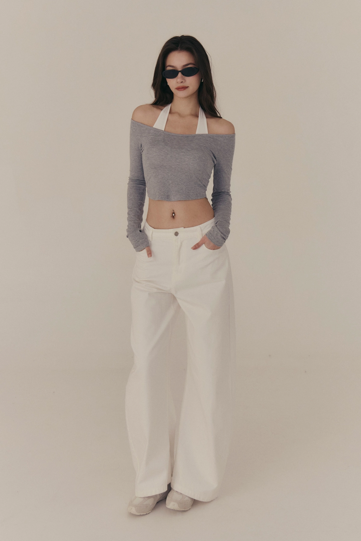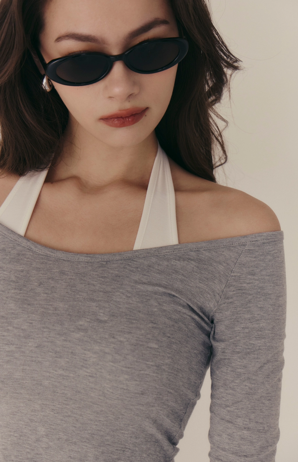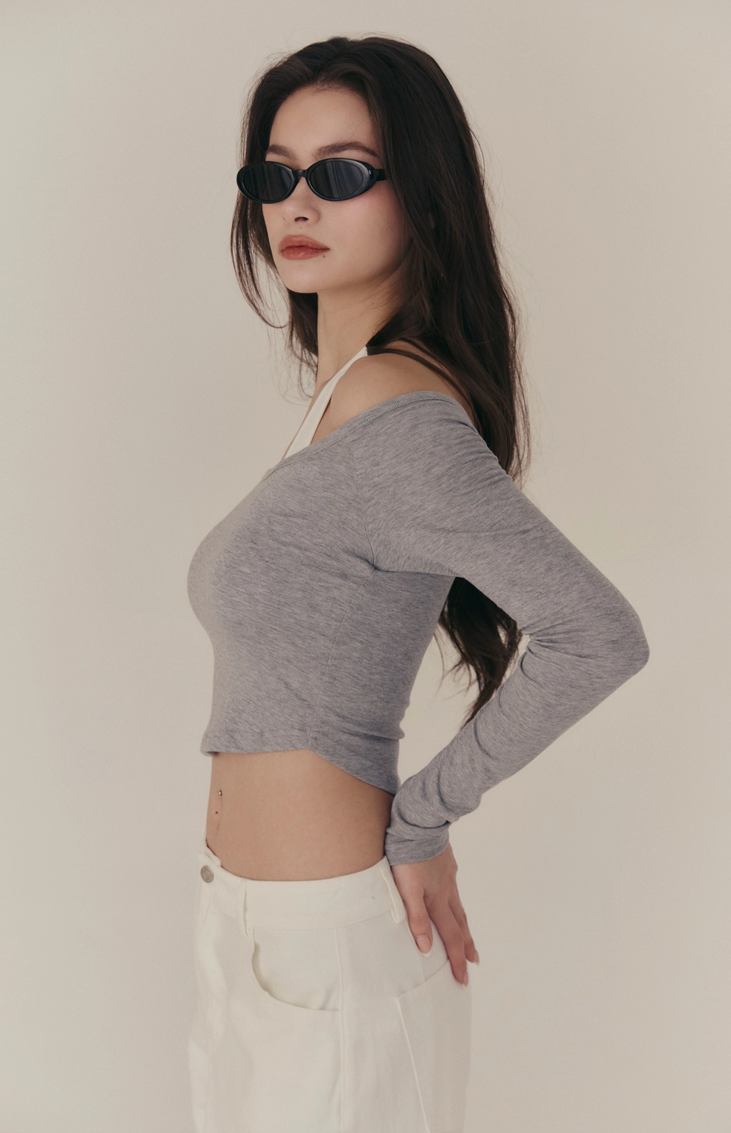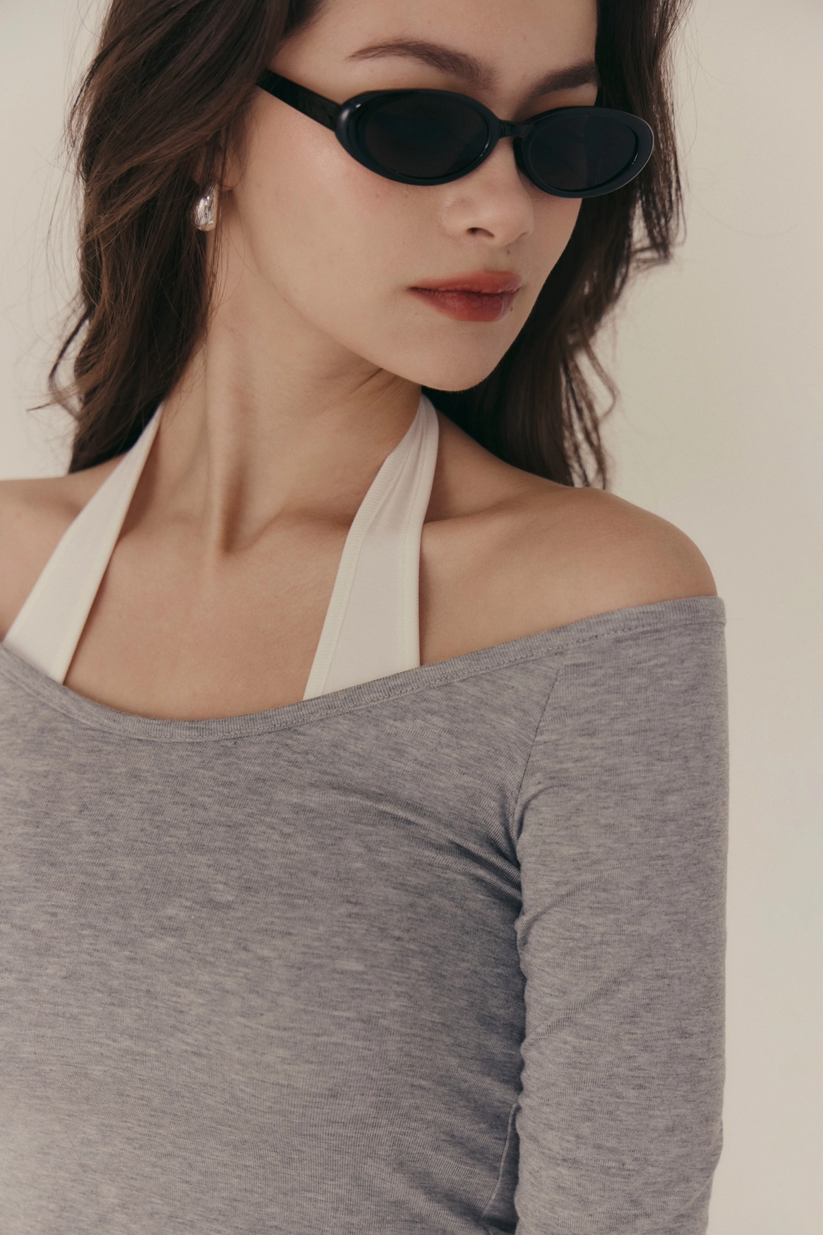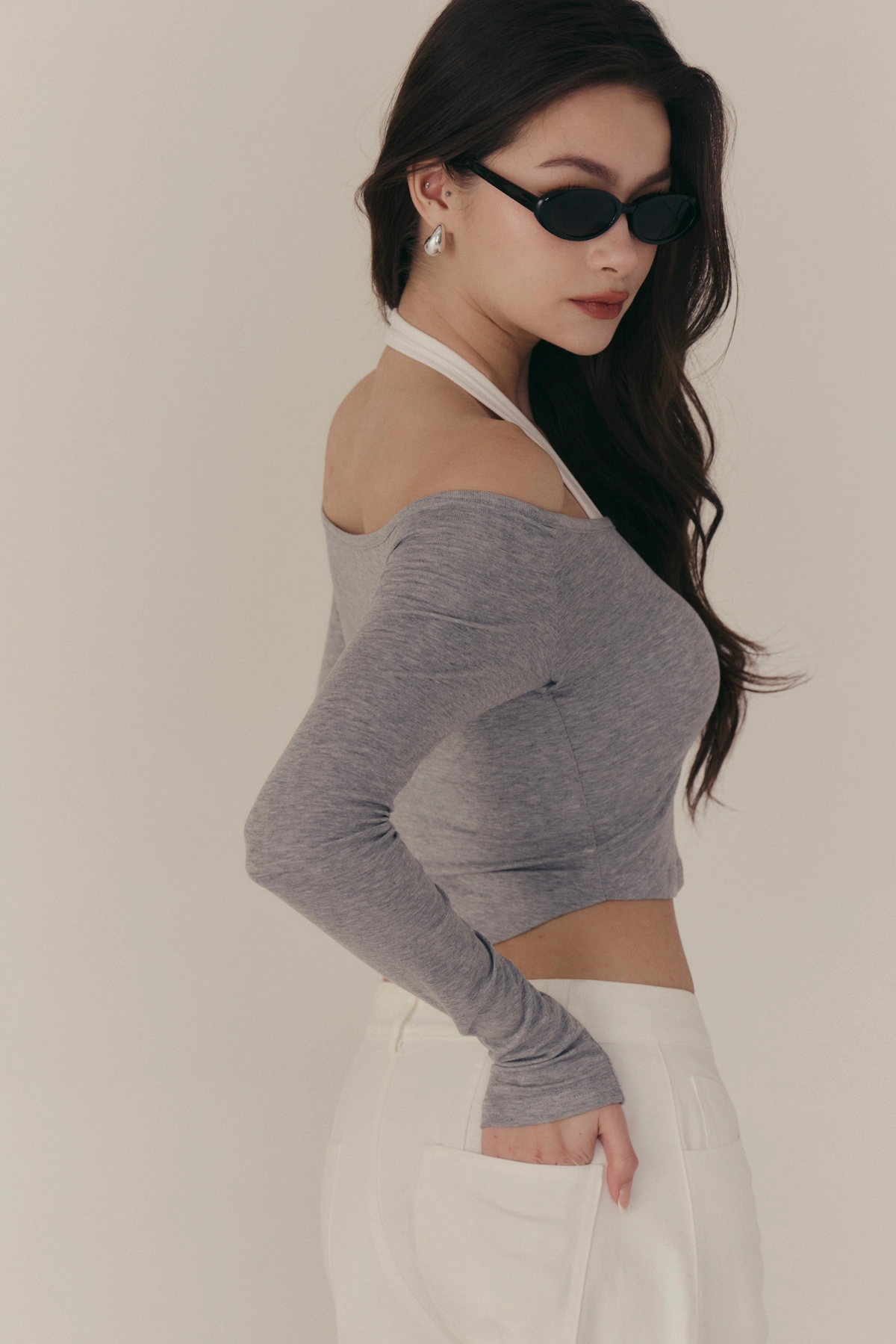 繞脖一字領假兩件長袖 Bra Top-花灰