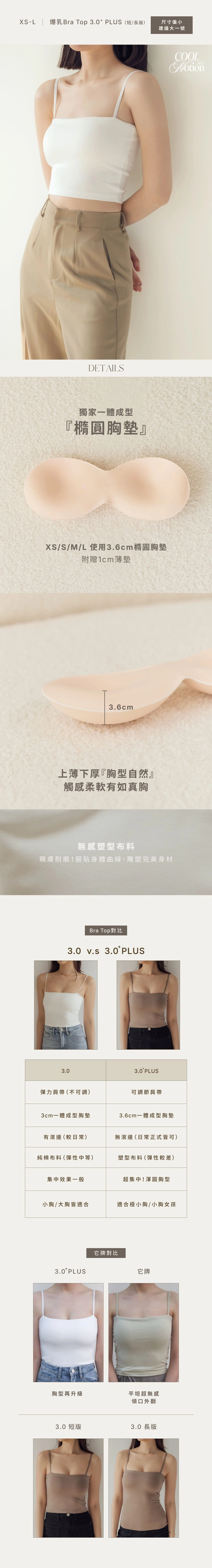 尺寸XS-XL使用獨家開模厚度3.6cm一體成型厚墊,且附贈薄胸墊乙個