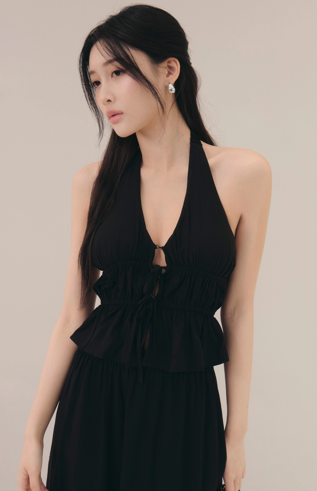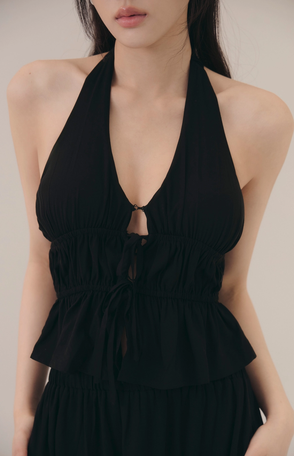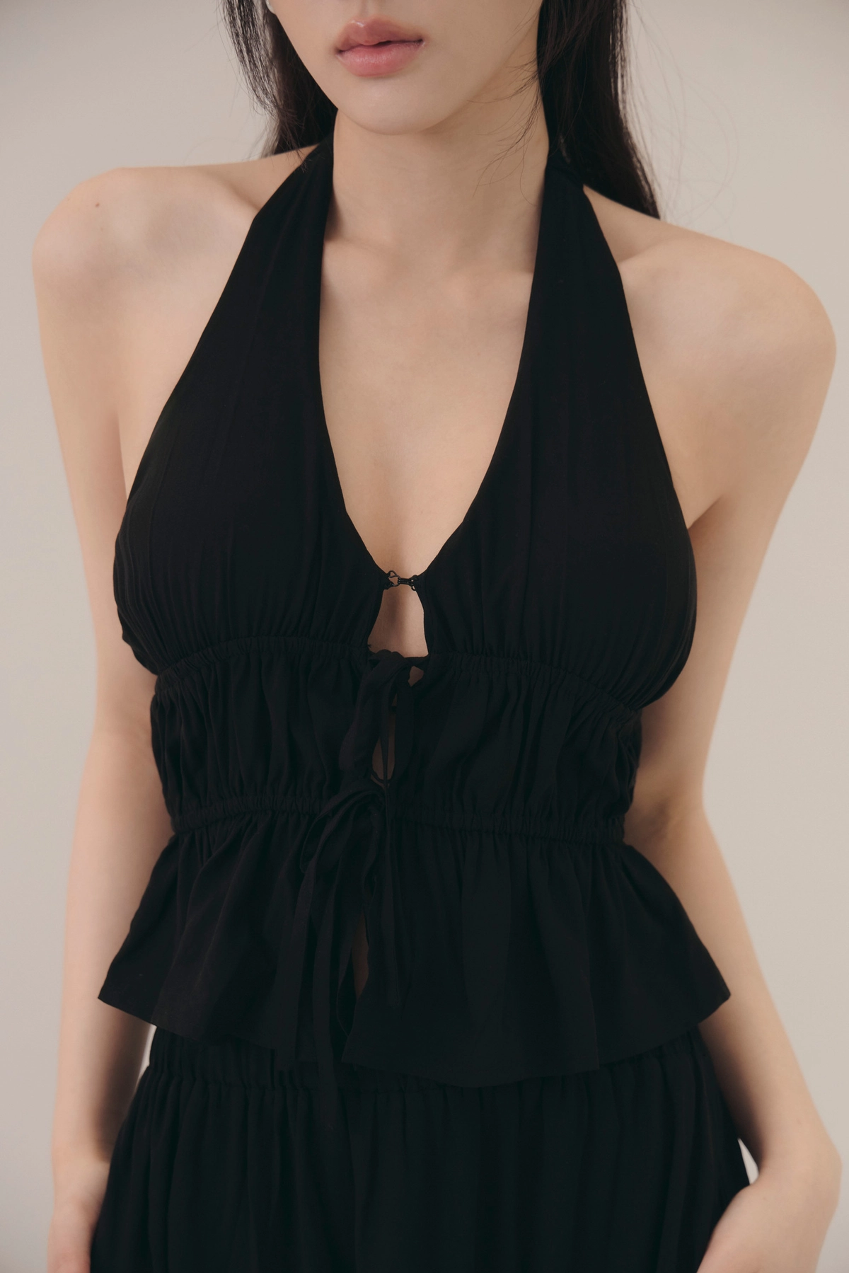 法式荷葉V領繞脖Bra Top-黑