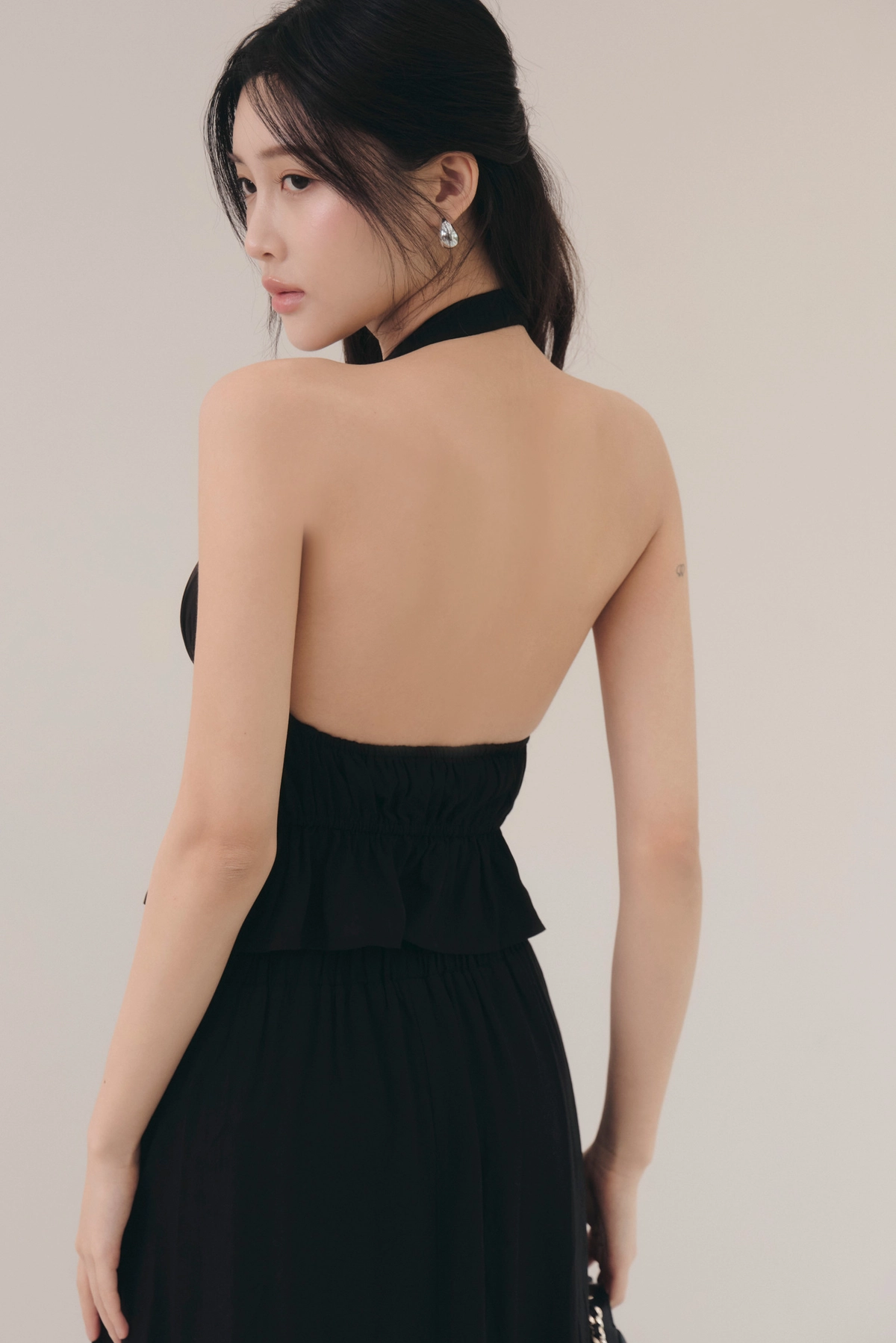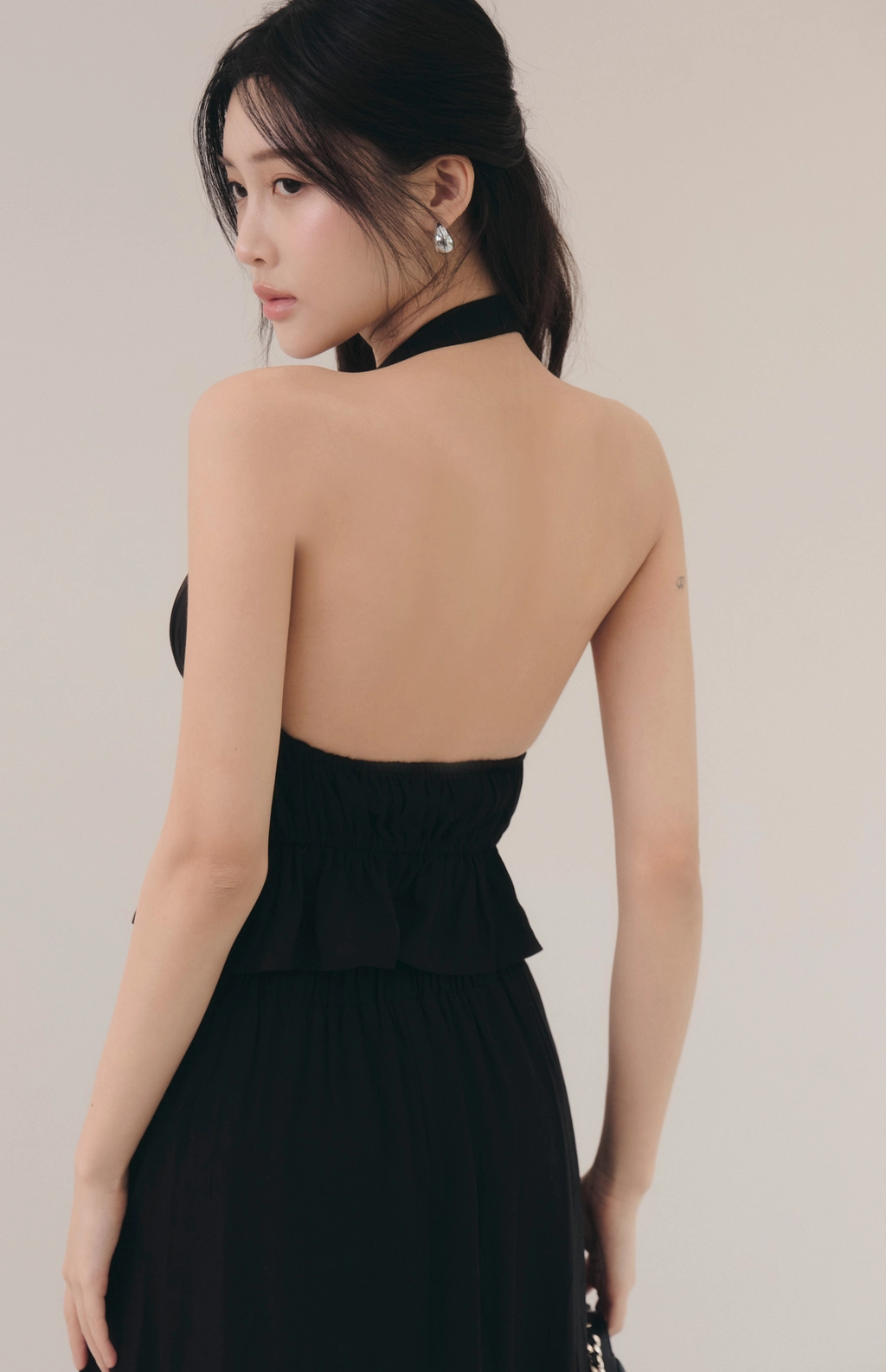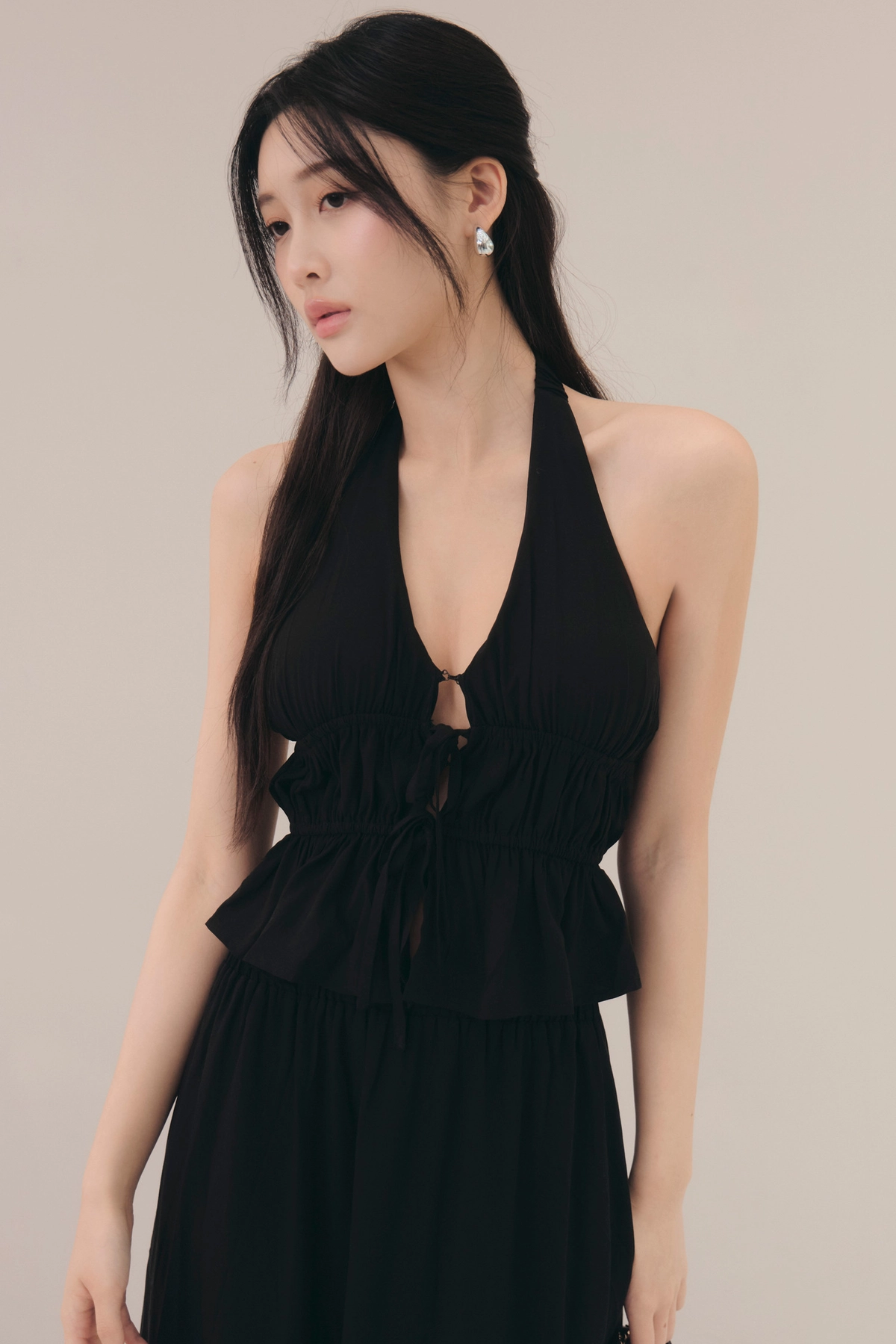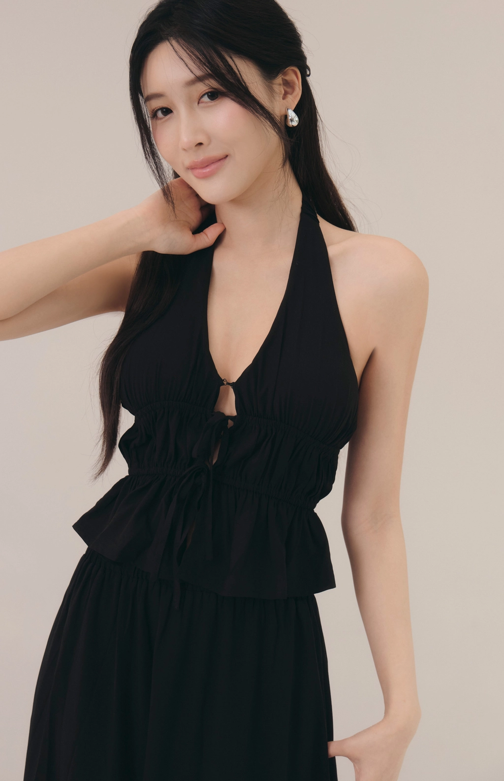法式荷葉V領繞脖Bra Top-黑