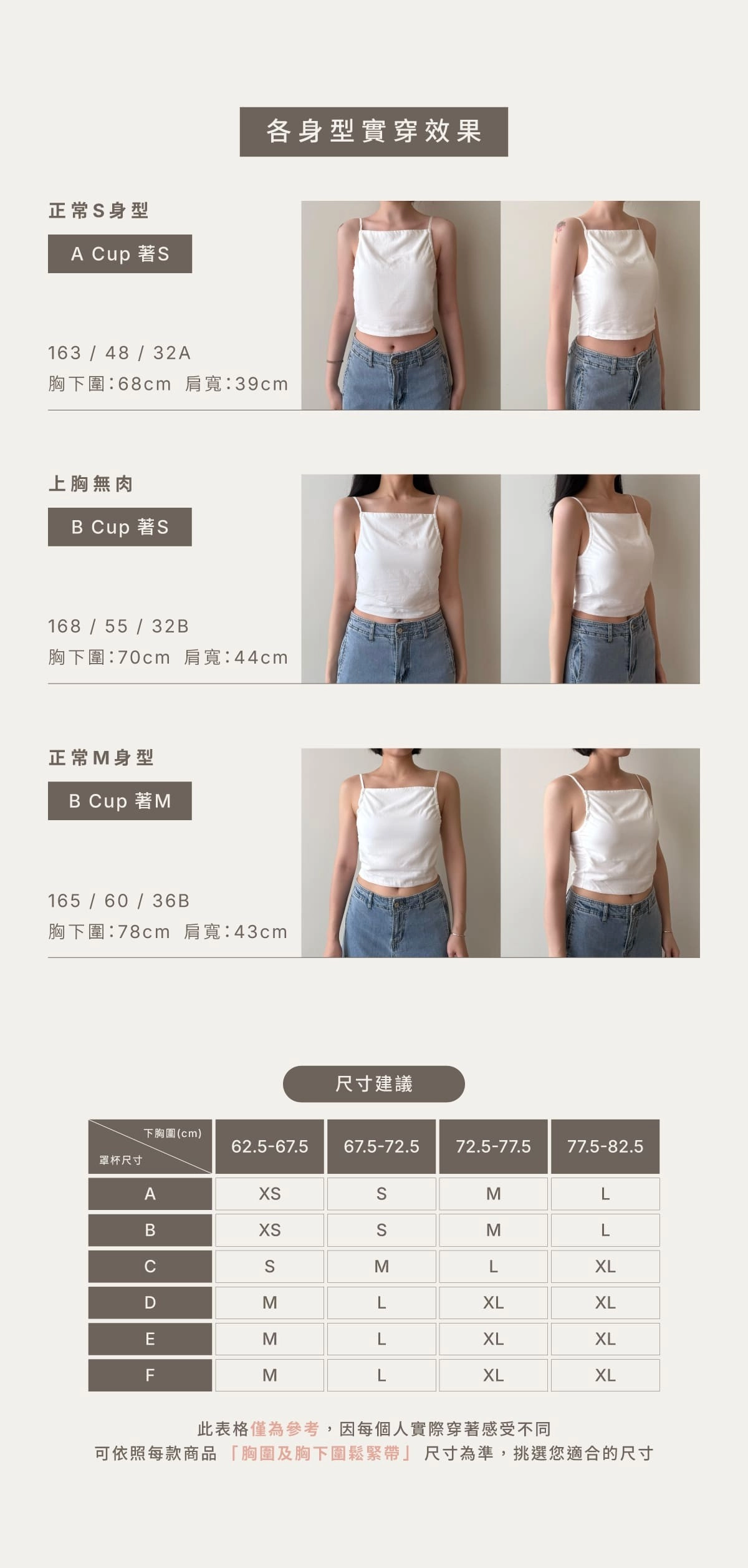BRA TOP尺寸選購除了要參考罩杯外也需參考身高、體重