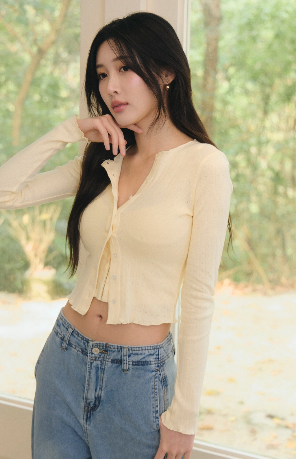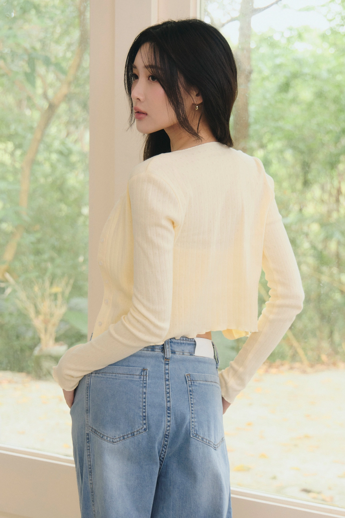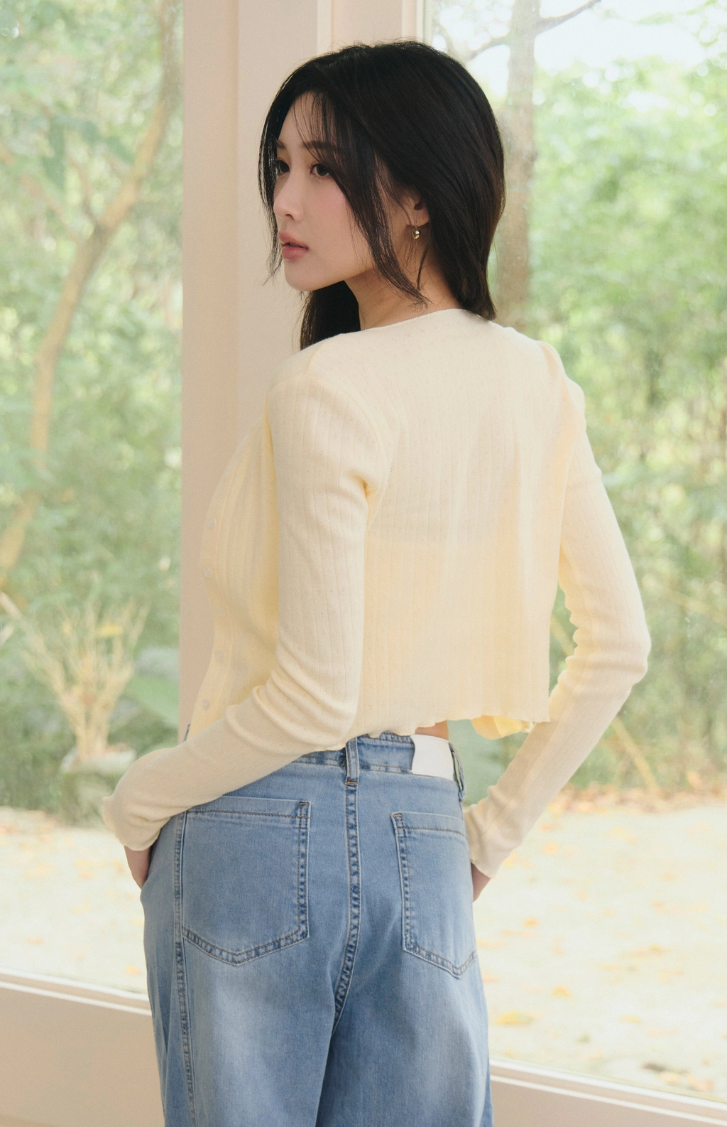 針織蕾絲花邊圓領開衫-淺黃
