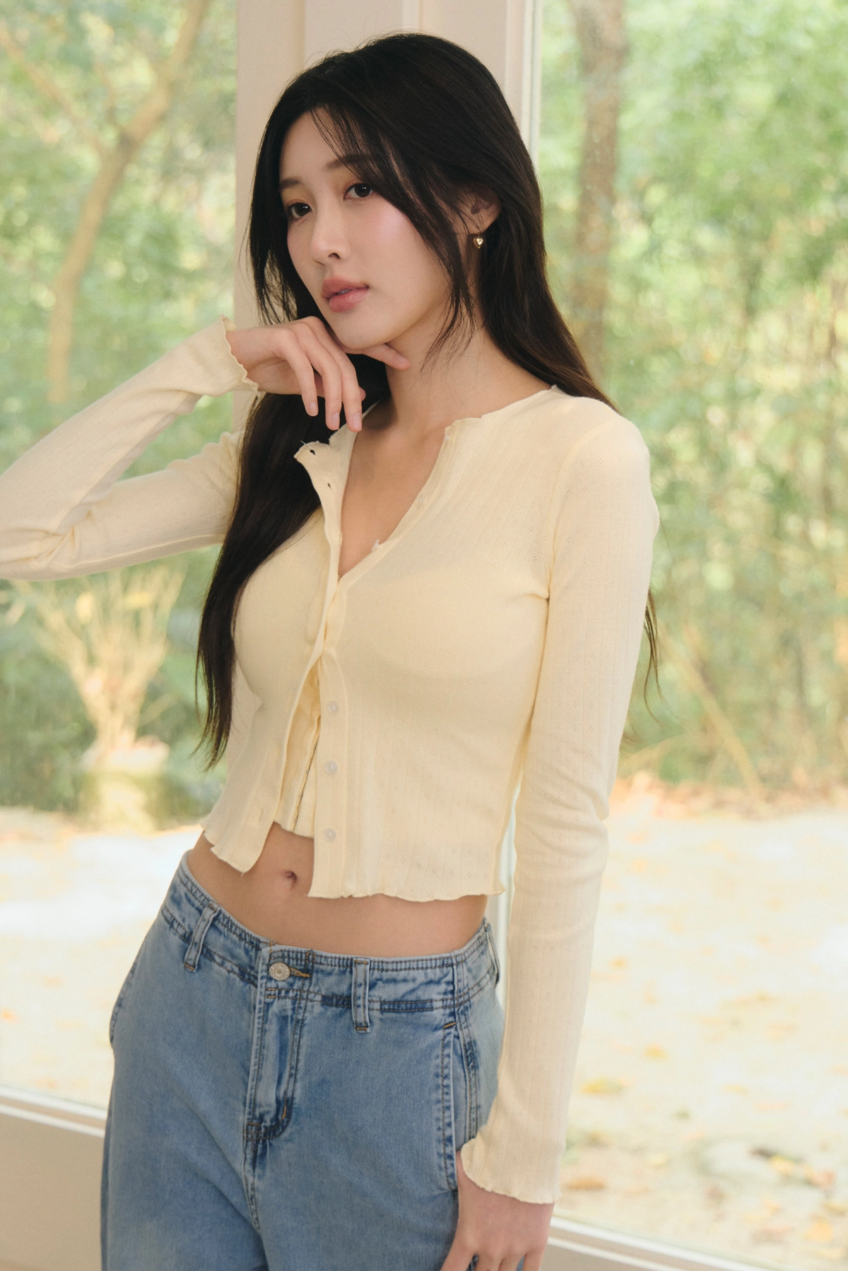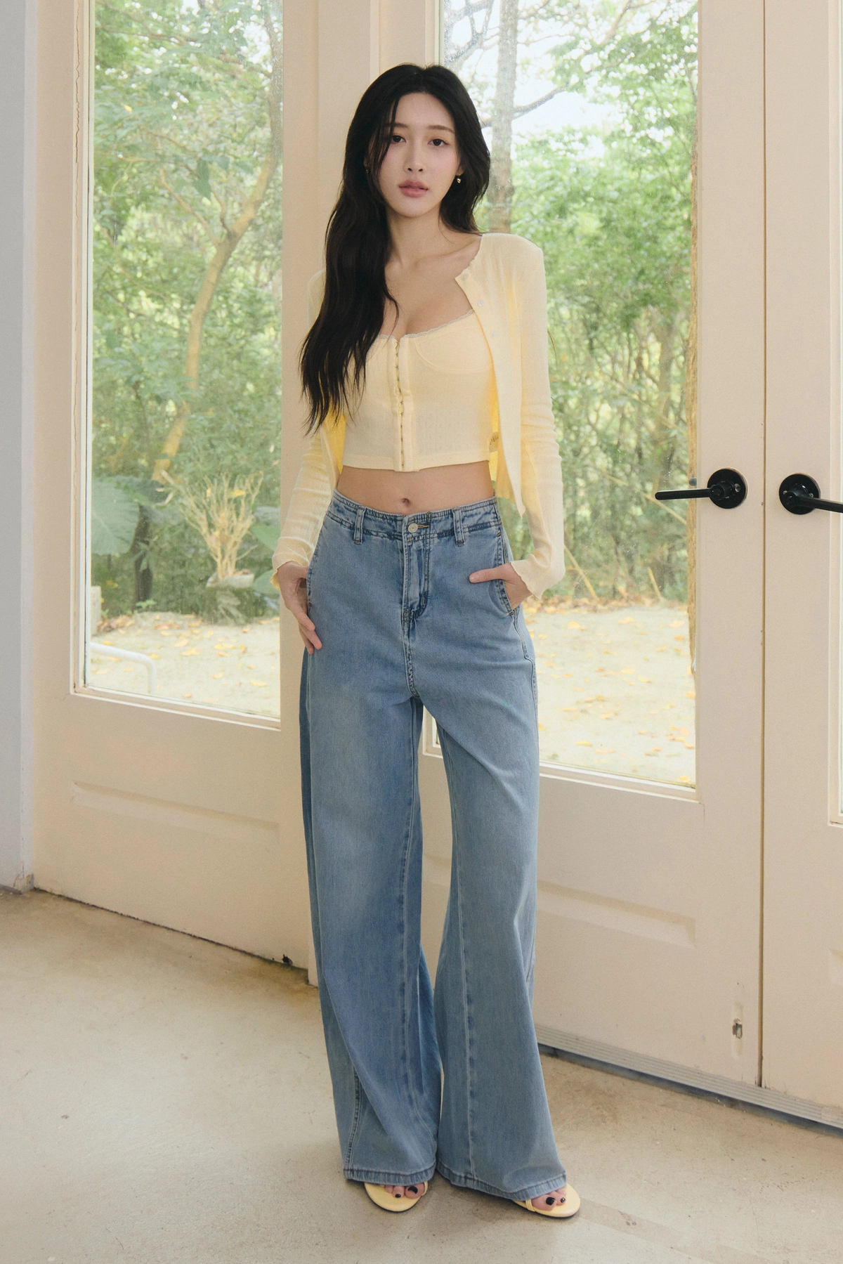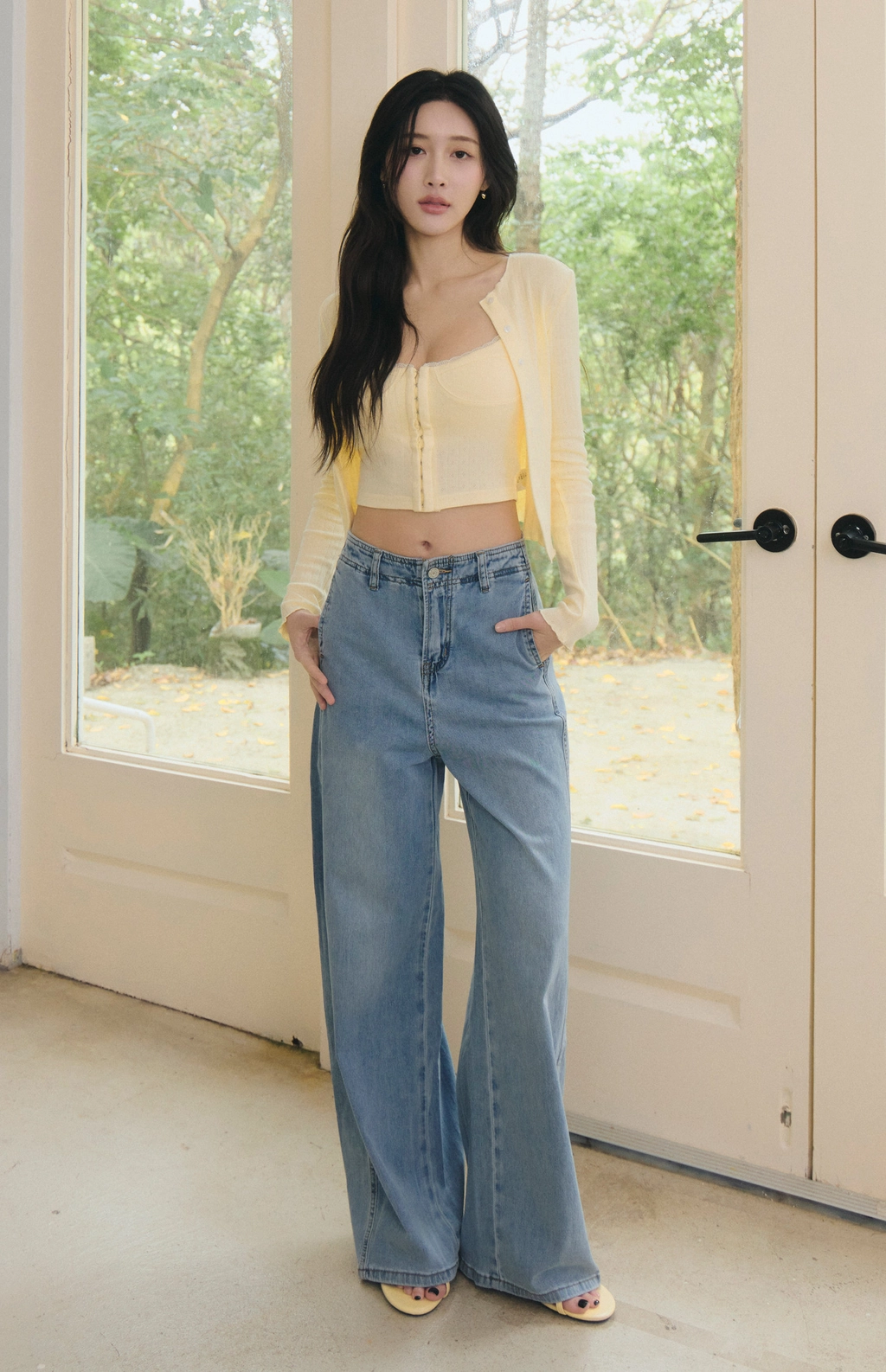 針織蕾絲花邊圓領開衫-淺黃