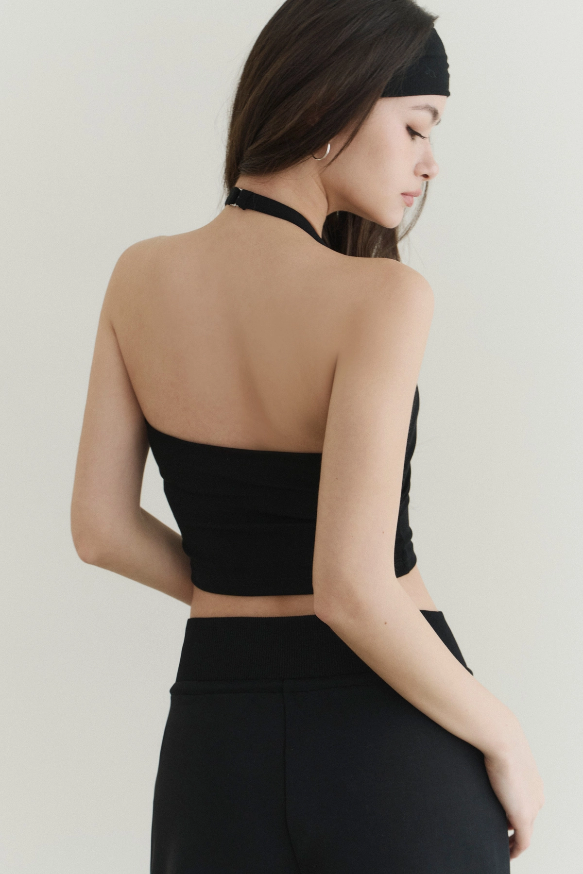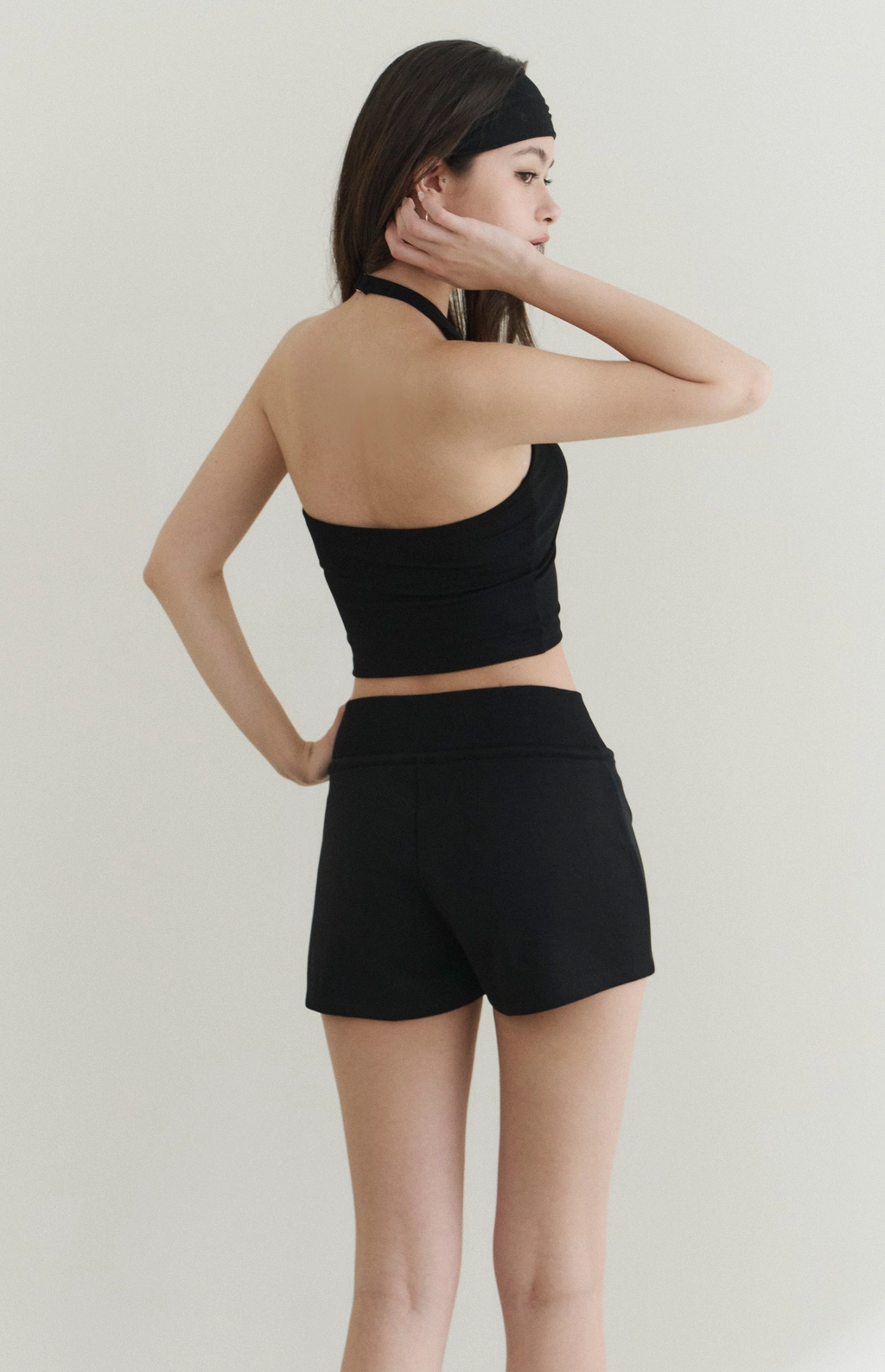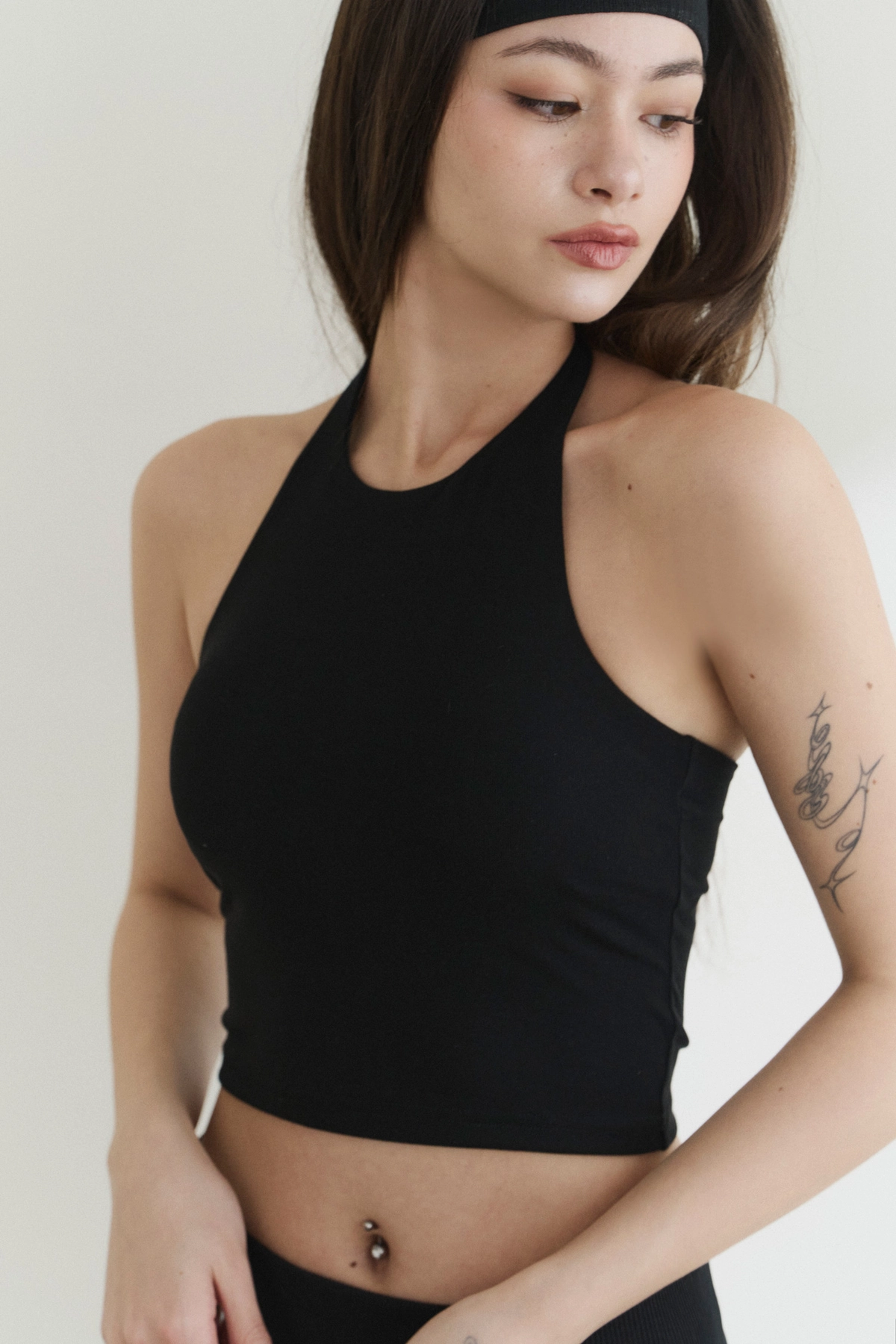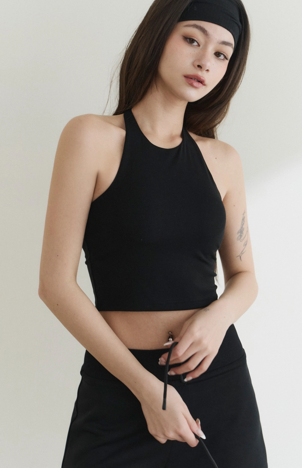 修身高領削肩Bra Top-黑