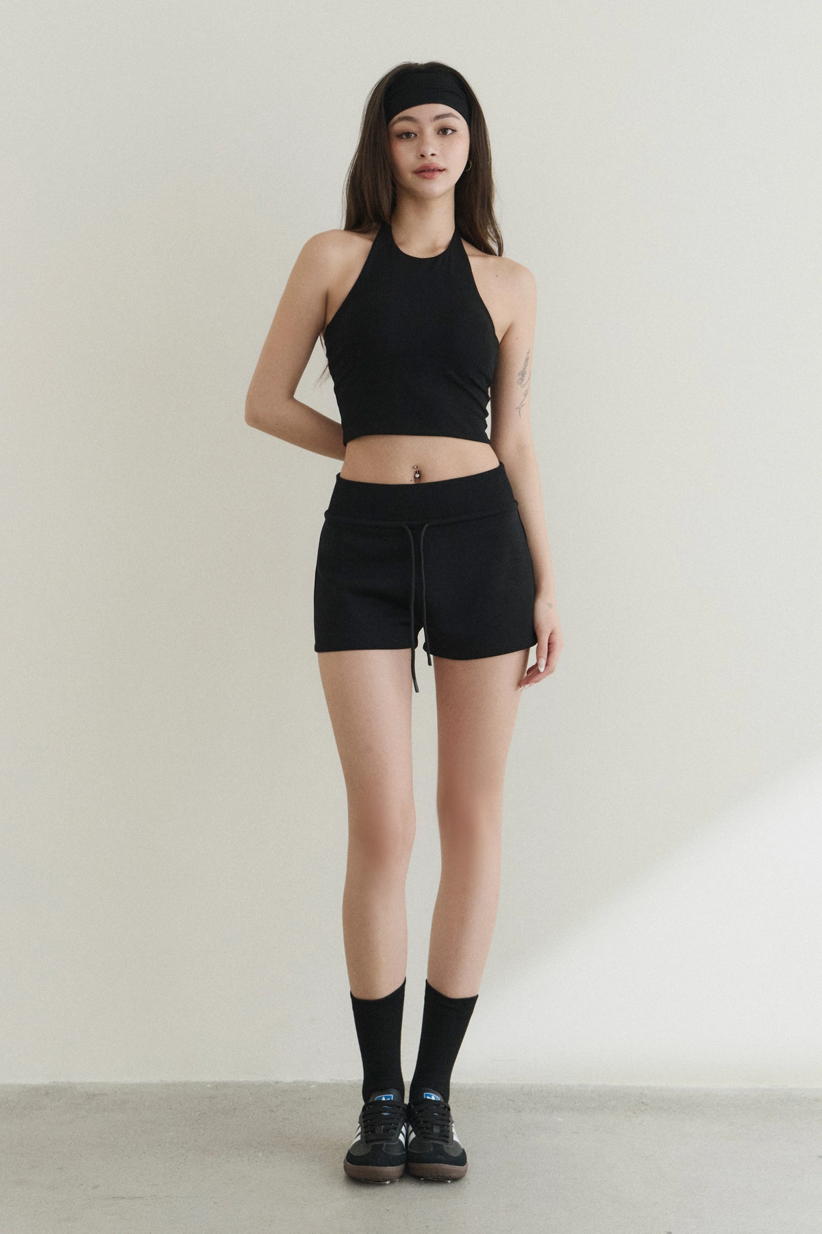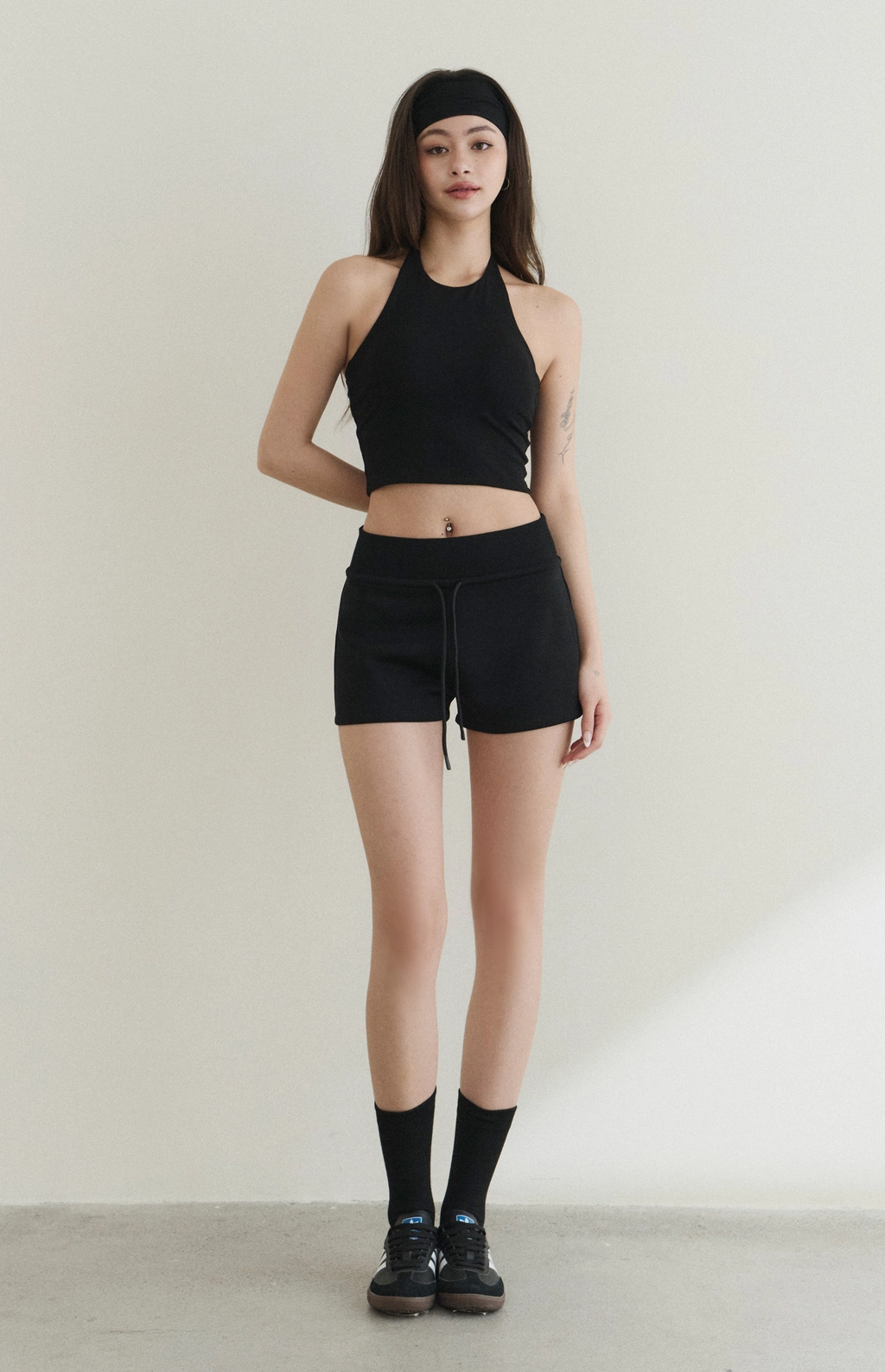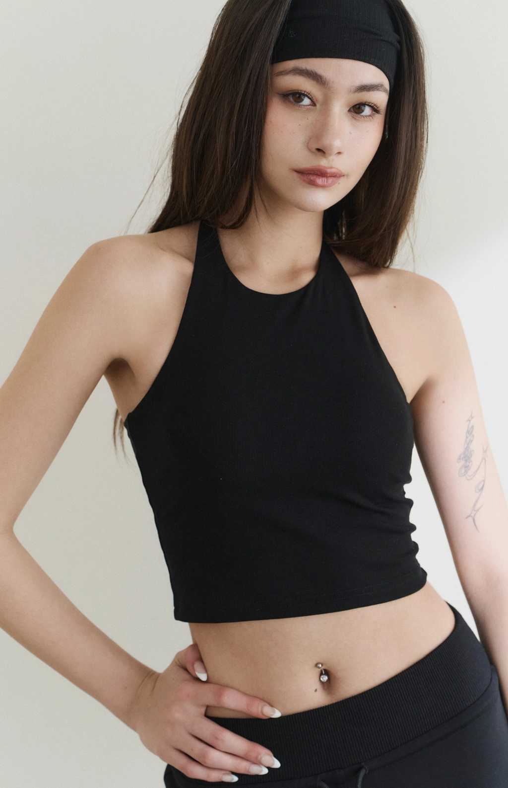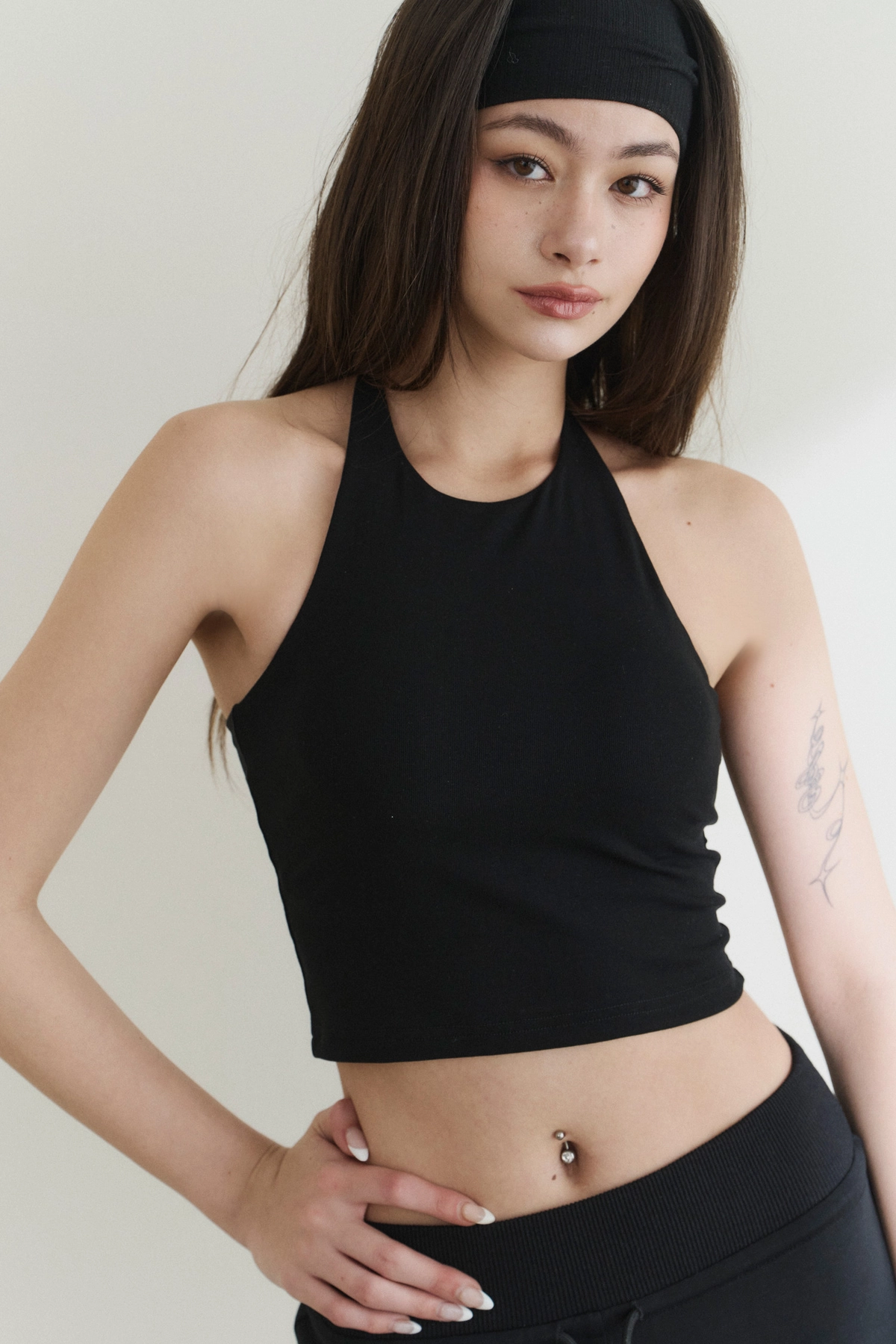 修身高領削肩Bra Top-黑