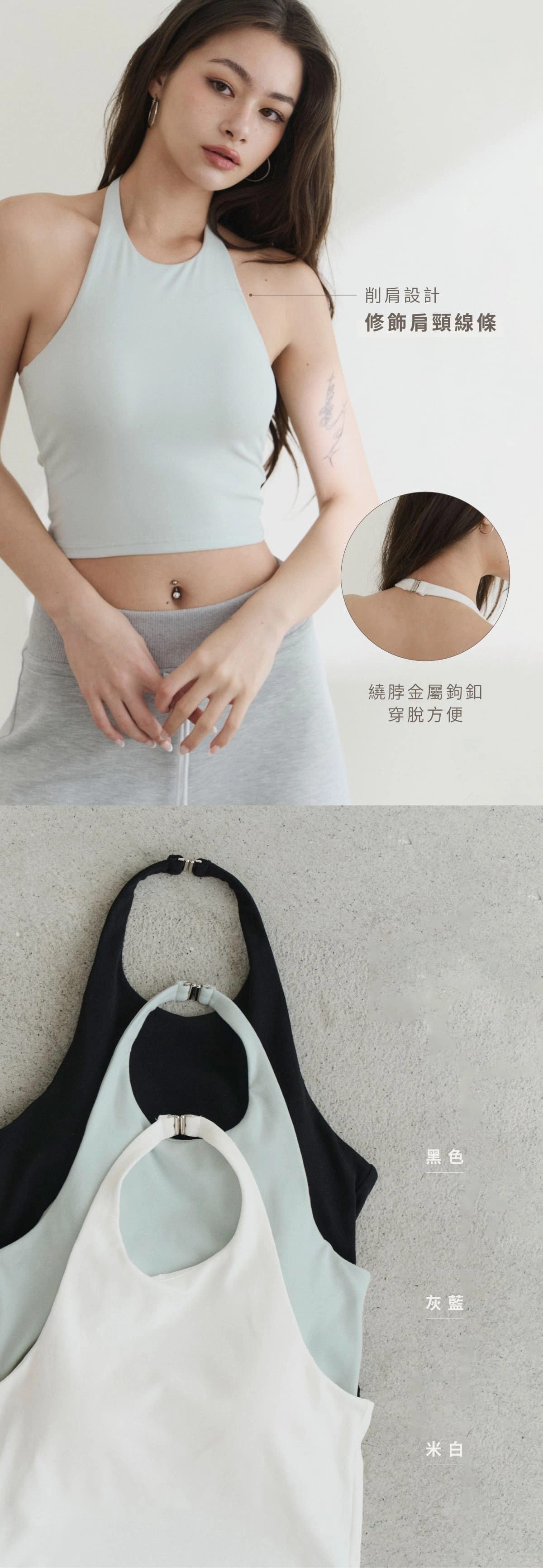 2.繞脖金屬鉤扣,穿脫方便