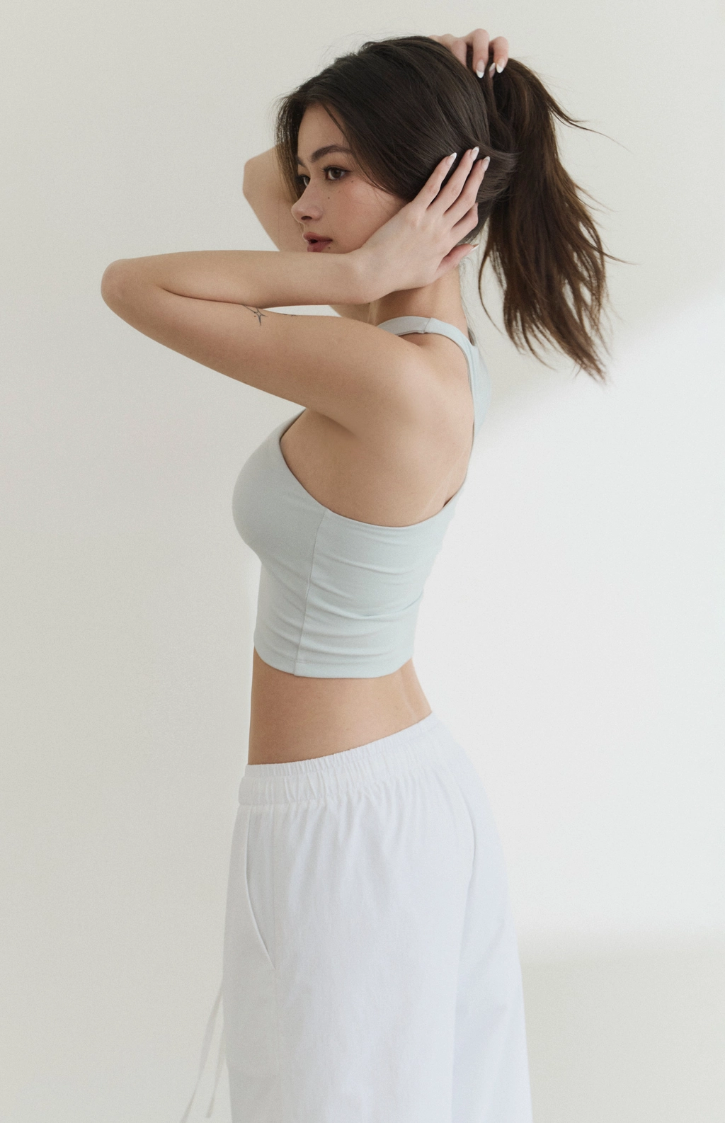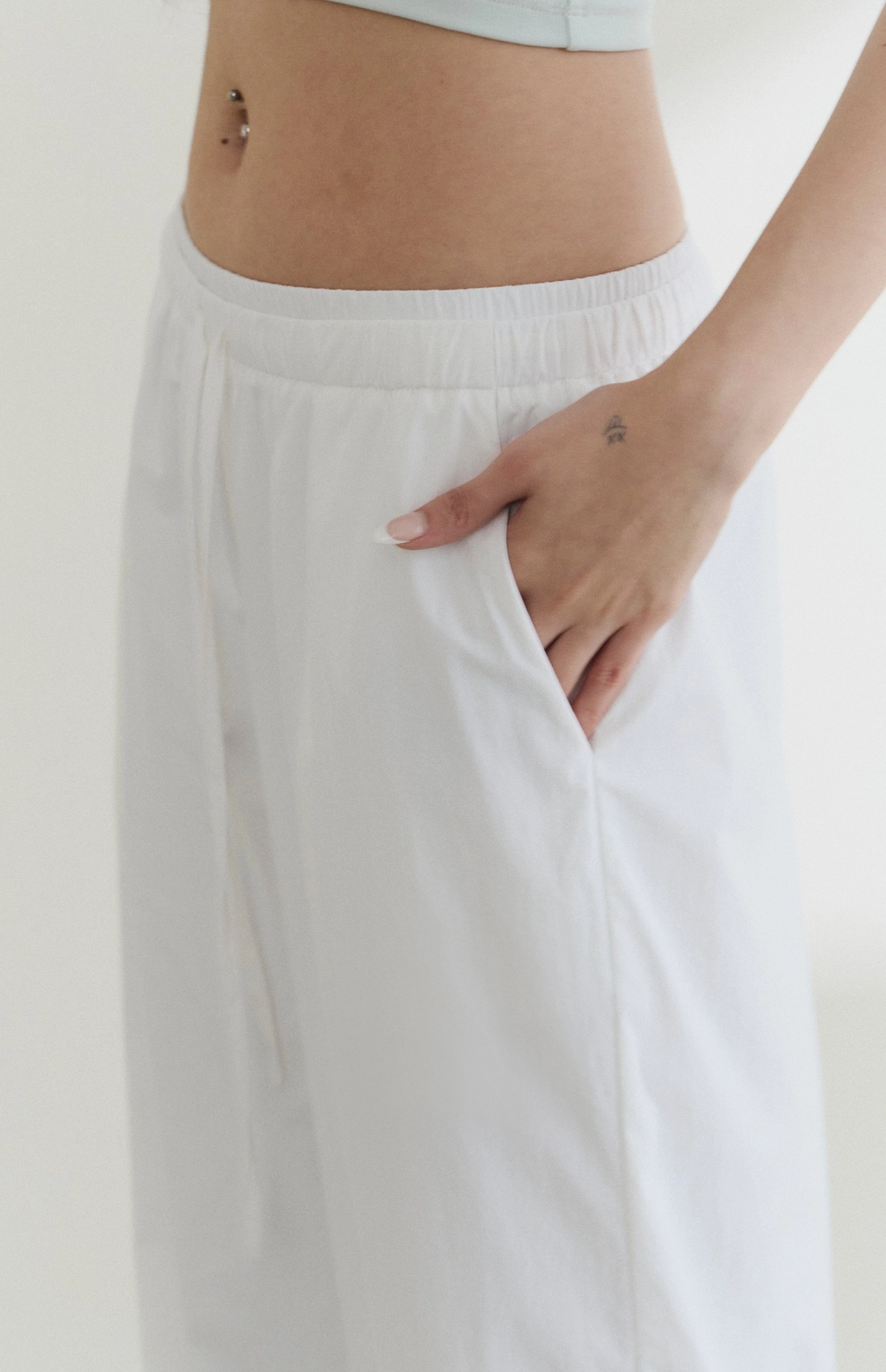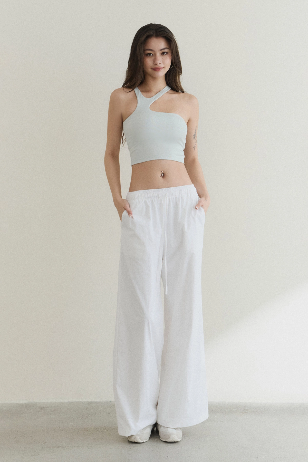 防曬抽繩假兩件直筒長褲-白